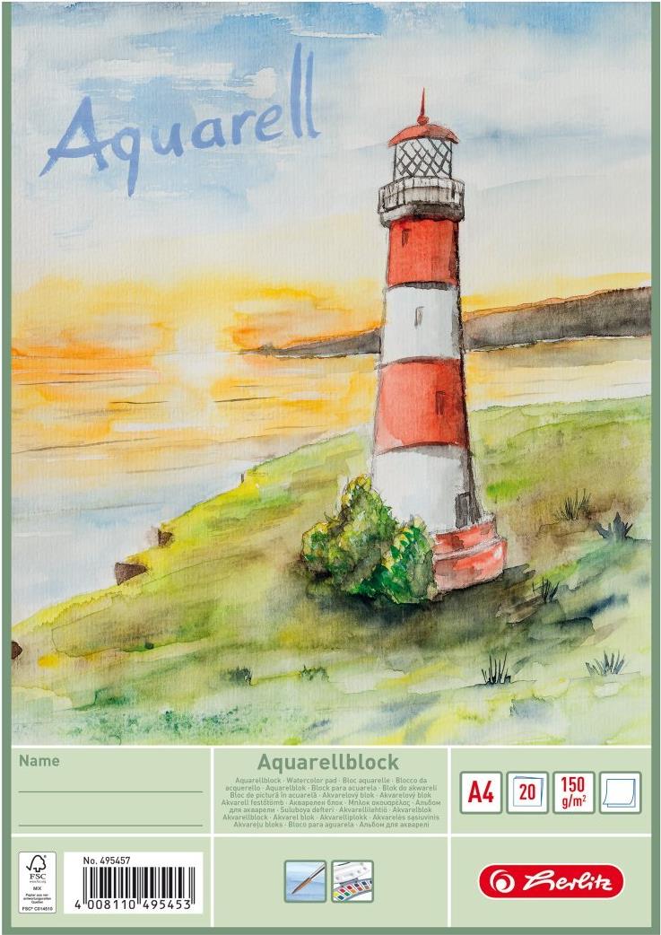 herlitz Aquarell-Block, 210 x 298 mm, Inhalt: 20 Blatt 150 g-qm, weiß, rauh, Studienqualität (495457)