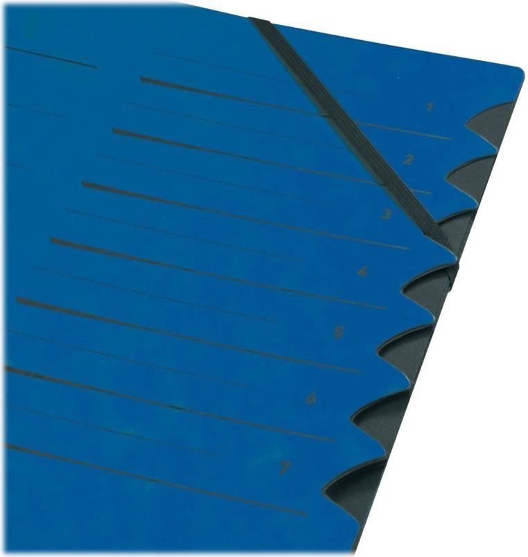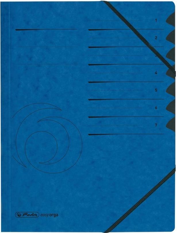 herlitz Ordnungsmappe easyorga, A4, Karton, 7 Fächer, blau Colorspan-Karton, 355 g/qm, innen schwarzer Manila-Karton, mit Sichtlöchern und Taben, 2 Gummizüge, schwarzer Organisationsdruck auf Vorderdeckel: 1 - 7 ...