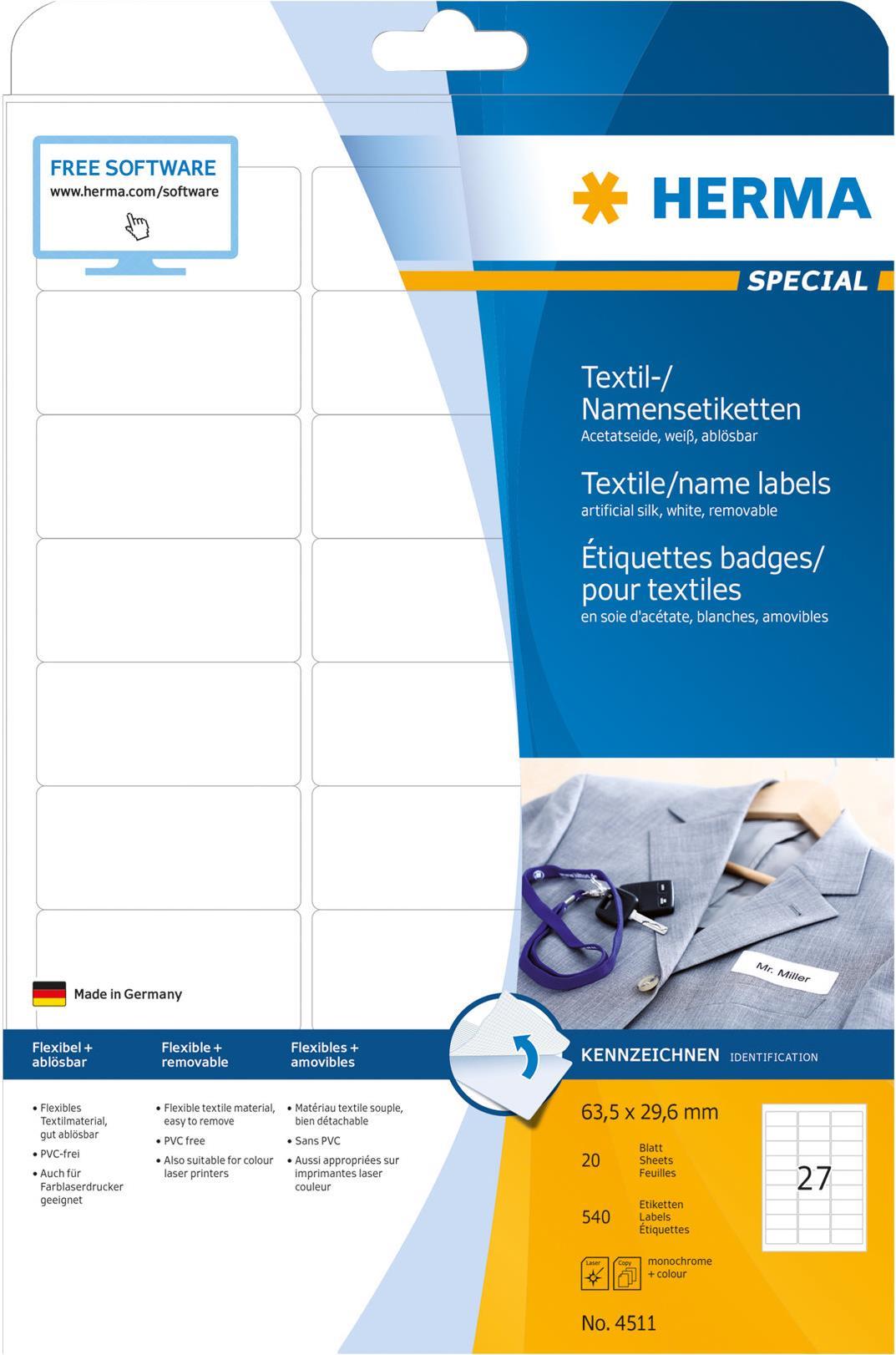 HERMA Special Name labels - Acetatseide - selbstklebend, entfernbarer Klebstoff - weiß - 63,5 x 29,6 mm 540 Etikett(en) (20 Bogen x 27) Etiketten (4511)