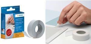 Doppelklebeband. Zweiseitig selbstklebendes Endlosband von der Rolle. Fotofreundliche Gummierung, praktisch für Haushalt, Büro, Atelier. Die zweite Klebeseite ist abgedeckt. Mit Abziehkante. Zu Beginn noch repositionierbar. Band kann abgerissen werden, eine Schere ist nicht nötig.