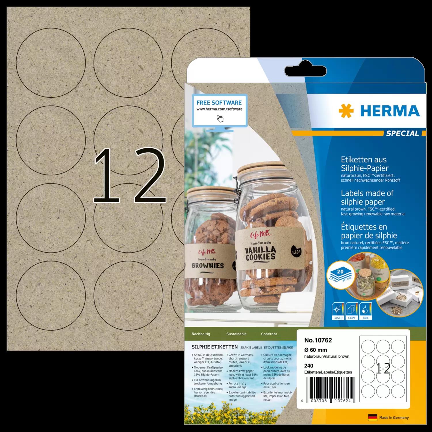 HERMA Etiketten aus Silphie-Papier, Durchmesser: 60 mm naturbraun, selbstklebend, permanent haftend, bedruckbar, - 1 Stück (10762)