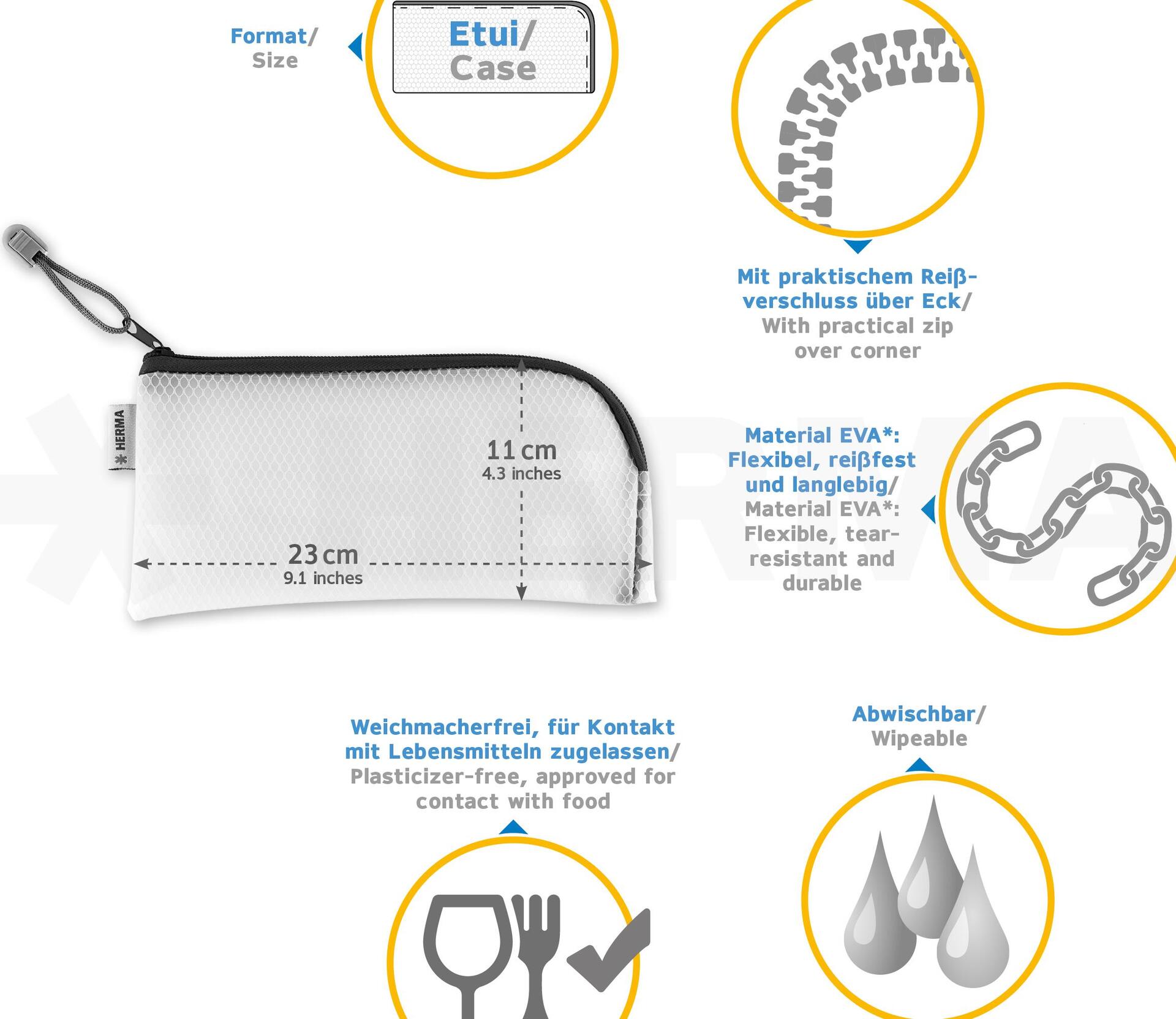 Das HERMA Universaltaschen-Etui, rot eingefasst, in der Größe 23 x 11 cm, mit praktischem Reißverschluss über Eck gibt es auch in den Farben blau, gelb, grün und orange. Die halbtransparente Tasche ist für viele ...