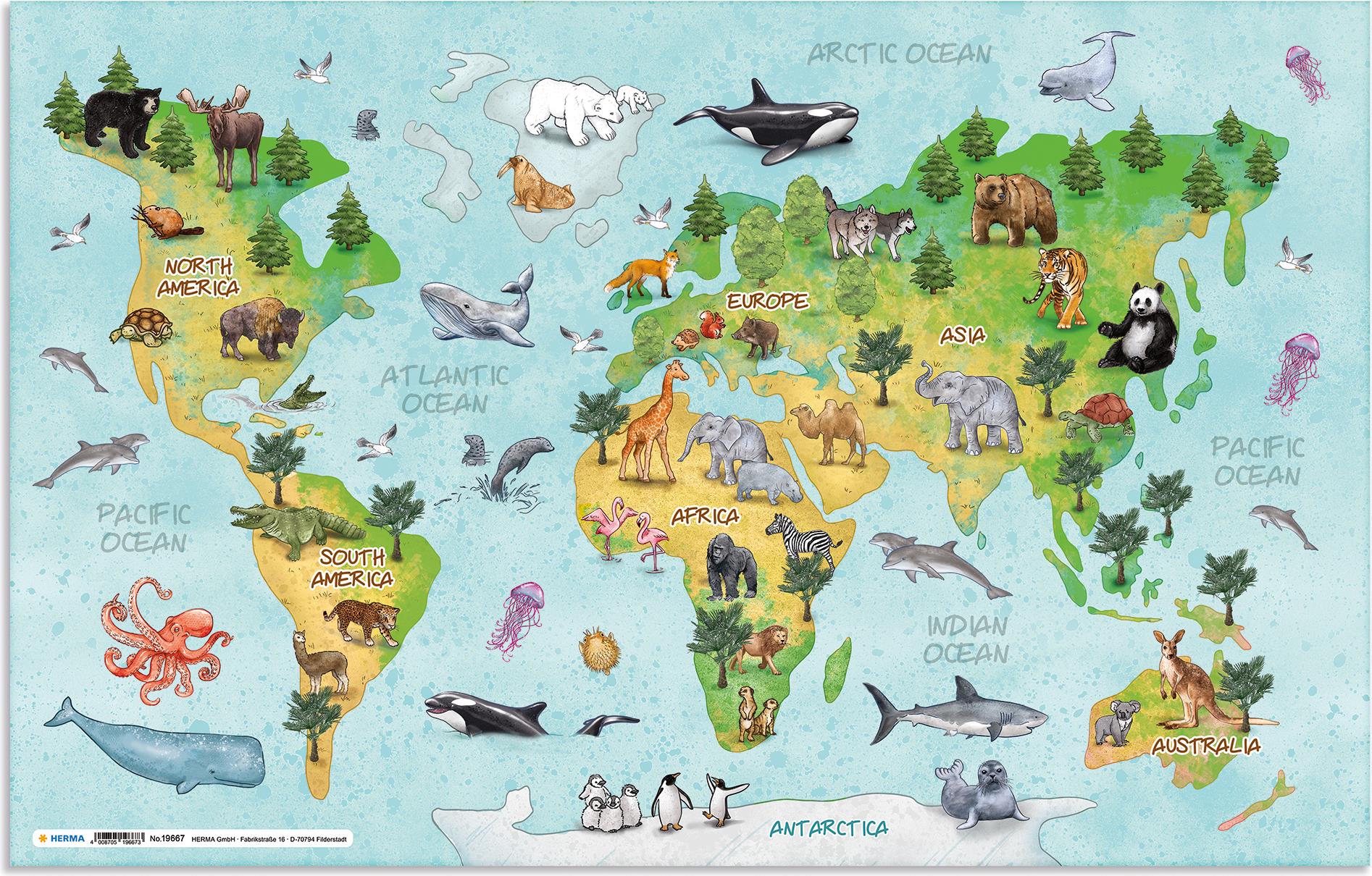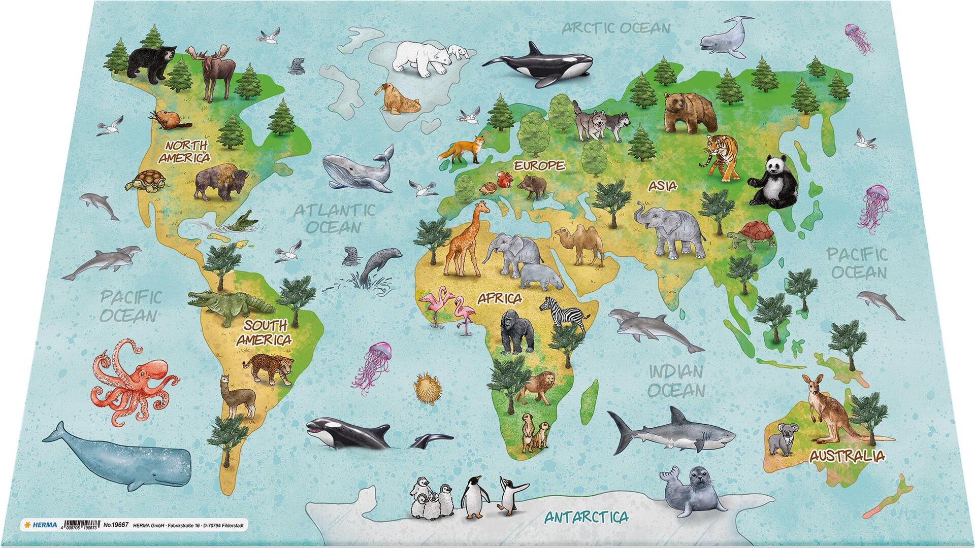 Kindgerecht und farbenfroh ist die Schreibunterlagen aus Karton von HERMA. Die fröhliche Weltkarte zeigt auf einen Blick, welche Tiere an welchen Orten der Erde beheimatet sind. Auf spielerische Art und Weise werden ...