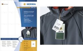 Etiketten aus stabilem Papier/Folie/Papier-Verbund, auf A4-Blättern, nicht klebend. Ideal für Produkt- und Preisauszeichnung, z.B. an Textilien oder Stoffballen oder als Colli-Anhänger. Mit vorgestanzter Lochung für die Befestigung mit Etikettierpistolen, Nylon/Faden, Draht, Schnur oder Fäden/Splinte. Einfach und schnell trennbar durch Mikroperforation. Für Laser- und Inkjetdrucker, Kopierer, Farblaserdrucker und Farbkopierer, beidseitig bedruckbar, oder zur Handbeschriftung. Kostenlose Softwarelösungen: www.herma.de/software.