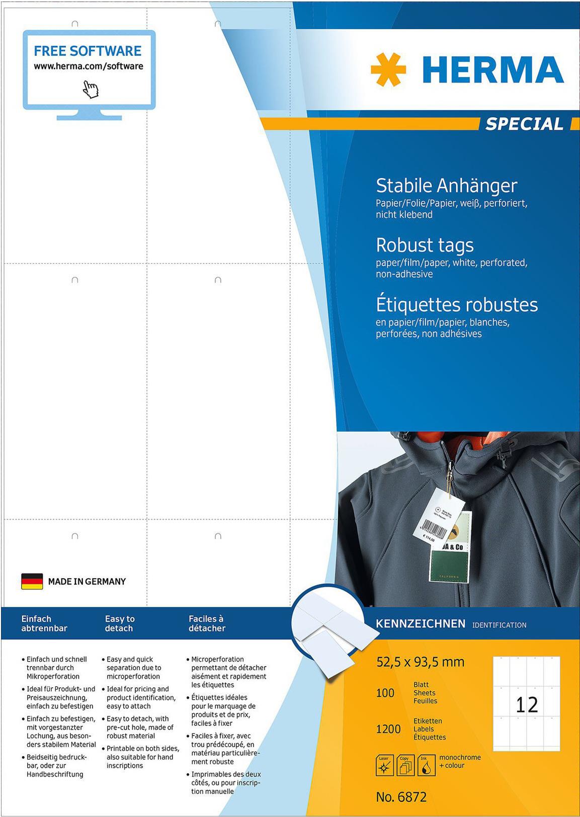 HERMA Special - Nicht klebende Etiketten, perforiert - weiß - 52,5 x 93,5 mm - 1200 Etikett(en) (100 Bogen x 12) (6872)