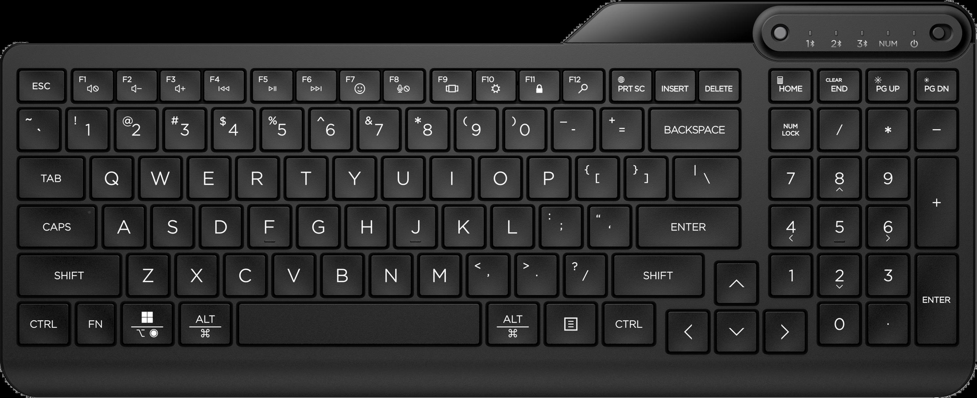 Volltastatur. Volle Mobilität. Voll Ihr Typ.Egal wo Sie unterwegs sind, mit der HP 460 Bluetooth-Tastatur für mehrere Geräte sind Sie immer einsatzbereit. Sie bietet einen vollen Funktionsumfang, ist leicht zu verstauen und begleitet Sie problemlos überall hin. Diese Tastatur kombiniert Vielseitigkeit (da mehrere Geräte gekoppelt werden können) mit funktionalem Design. Dadurch sorgt diese echte Mehr-Geräte-Tastatur dafür, dass Sie beim Arbeiten und Spielen in Bewegung bleiben können und dabei immer eine stabile Verbindung haben.Hauptmerkmale