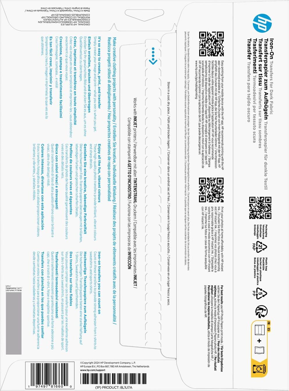 Das HP Transferpapier 8L1U7A ist eine hochwertige Bügelfolie für dunkle Textilien. Es eignet sich für Baumwolle, Polyester und Mischgewebe und ist für Tintenstrahldrucker optimiert. Die A4-Bögen ermöglichen das einfache Erstellen, Drucken und Übertragen eigener Motive mit kräftigen Farben und klaren Details. Ideal für personalisierte Kleidung, Taschen und kreative Projekte.