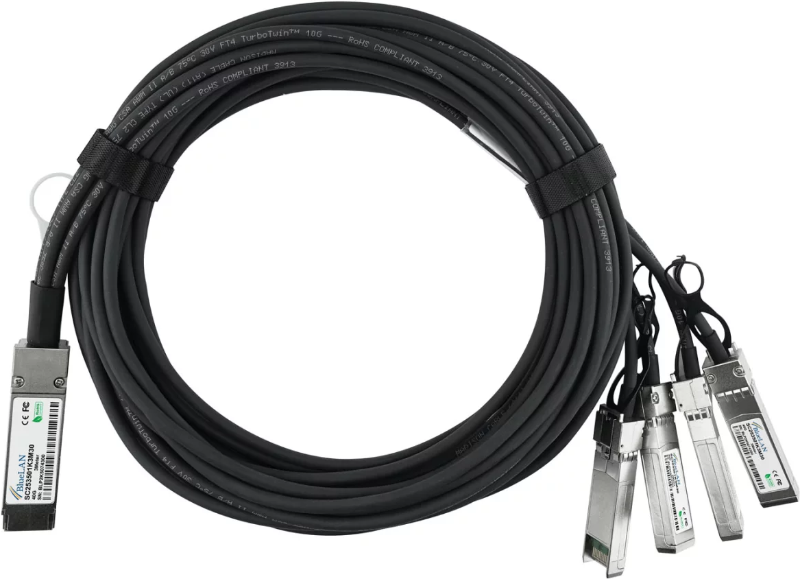 HPE JH700A kompatibles Breakout Direct Attach Kabel (DAC) als passive 40 Gigabit zu 4x10 Gigabit Twinaxial Kupfer Variante, mit QSFP+ auf 4xSFP+ Verbindung, für den Anschluss von Hardware in Racks und über benachbarte Racks hinweg. BlueLAN HPE JH700A komp (JH700A-BL)