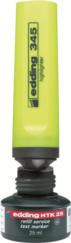 Nachfülltinte edding HTK 25 refill service text marker. Zum Nachfüllen der Highlighter edding 24, 340, 345. Geruchsneutrale, lichtbeständige Tinte auf Wasserbasis in einer Flasche mit Kapillarsystem. Marker einfach mit ...