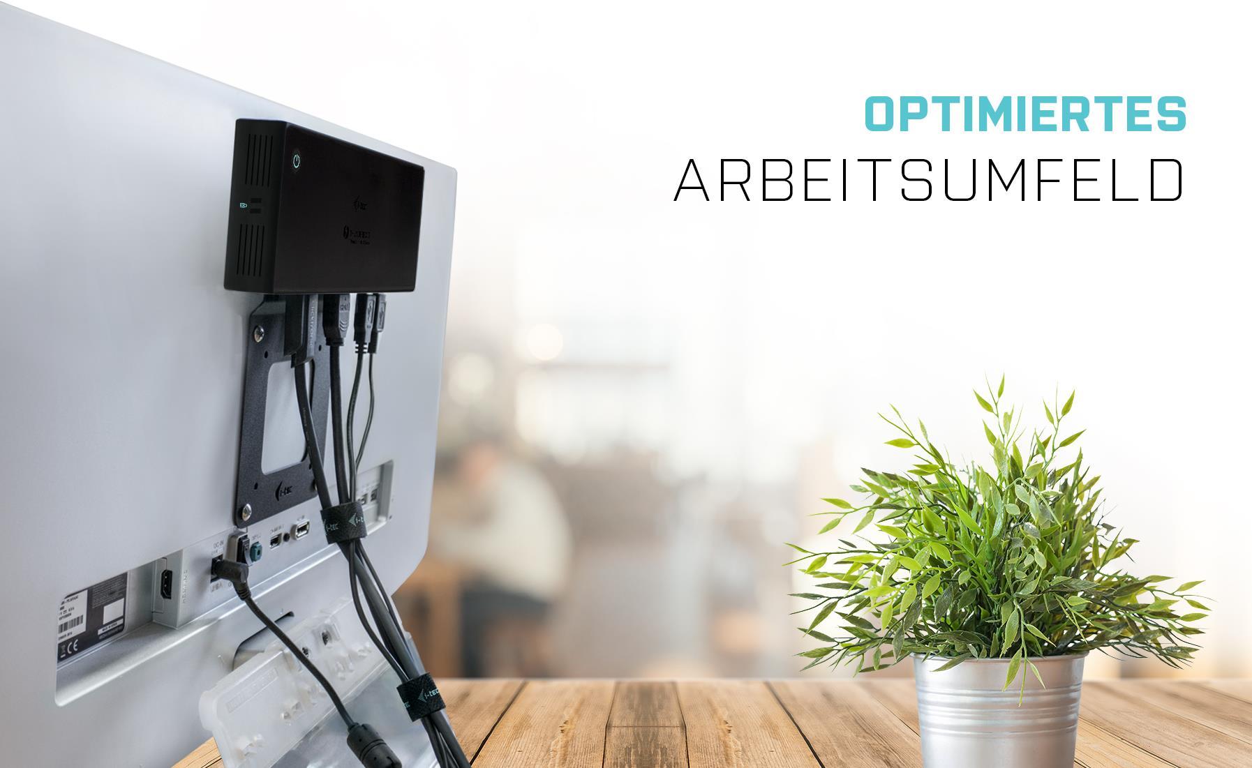 | Leistungsmerkmale | Slot für Sicherheitsschloss (Kabelschloss getrennt erhältlich), Ein-/Ausschalter, Unterstützung für VESA-Schnittstelle, Halterung für zwei Monitore, 85 W-Spannungsversorgung |