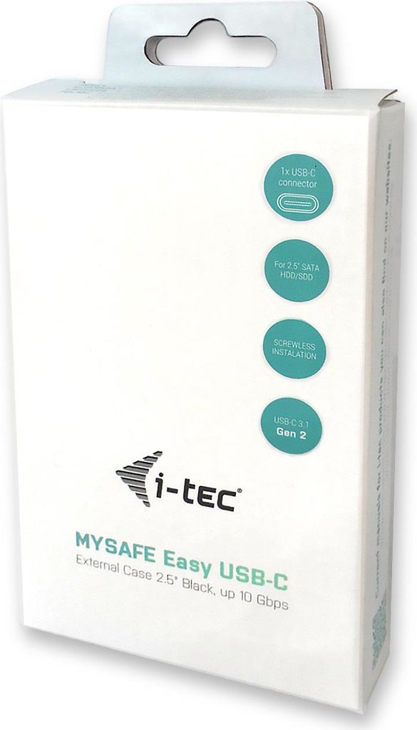 i-tec MySafe USB-C Easy ist ein externes Gehäuse zum Anschluss von 2.5" SATA Festplatten an Ihren PC, Notebook, TV oder anderen Multimediageräten mit Hilfe von USB-C Schnittstelle, über die es gleichzeitig versorgt wird. Das Gehäuse kann zur Datenmigration und -sicherung oder zur Datenübertragung vom beschädigten Notebook genutzt werden.