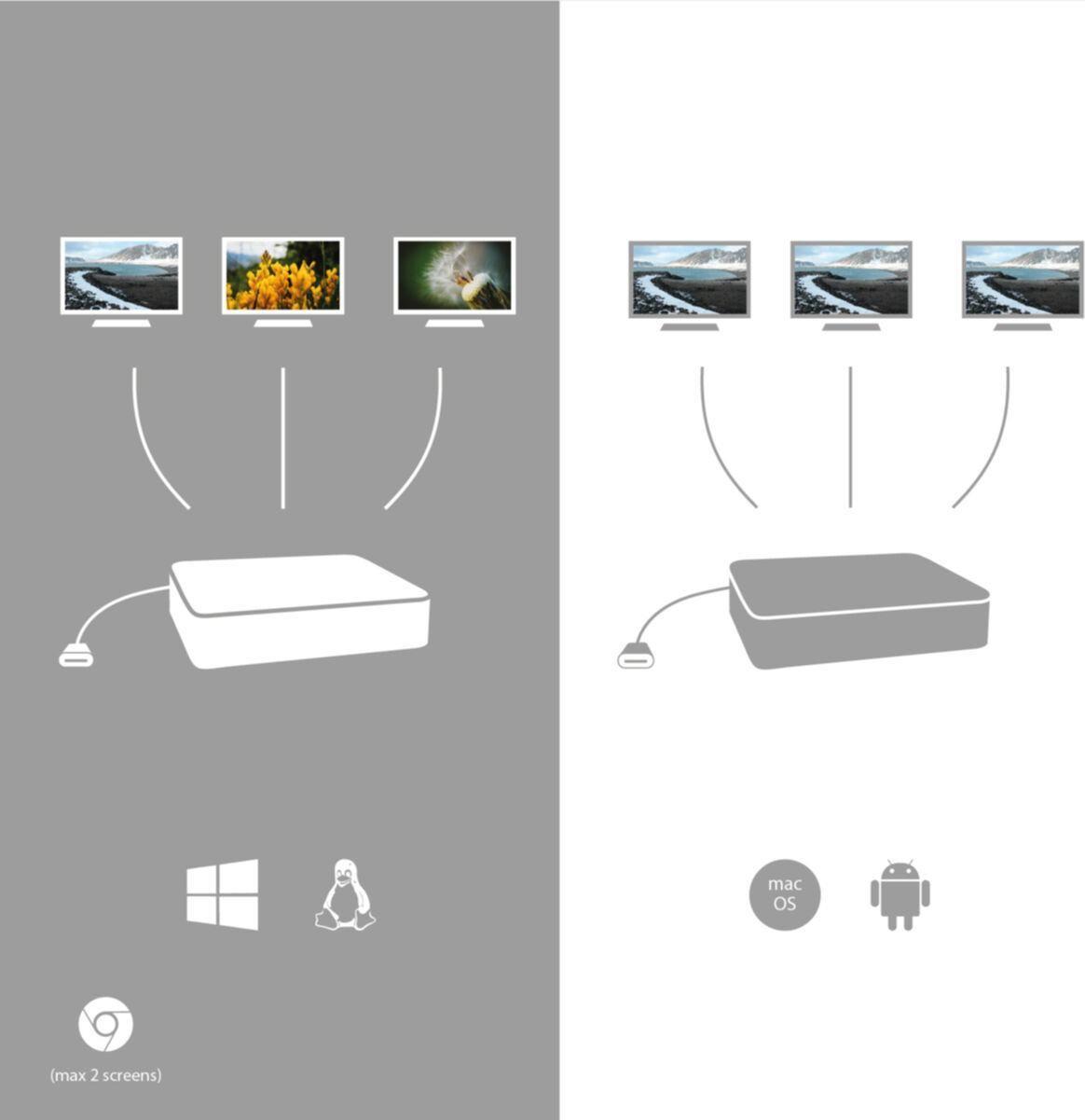 Ergonomische USB-C-Docking-Station aus Metall, welche bis zu 3 externe Bildschirme unterstützt. Die Station ist mit jedem Notebook kompatibel, das über einen USB-C- oder Thunderbolt -3-Port verfügt (das integrierte Kabel mit einer Länge von 60 cm ist lang genug, um alle Notebooks an einen Bildschirm bis zu einer Größe von 15" anschließen zu können). Diese Docking-Station verfügt über 4x USB-Port. Aufgrund des integrierten LAN-Ports und der Stromversorgung von bis zu 85 W zuverlässiger und schneller Anschluss ans Firmennetz. Aufgrund ihrer Ausführung kann sie auch als Notebookständer verwendet werden.