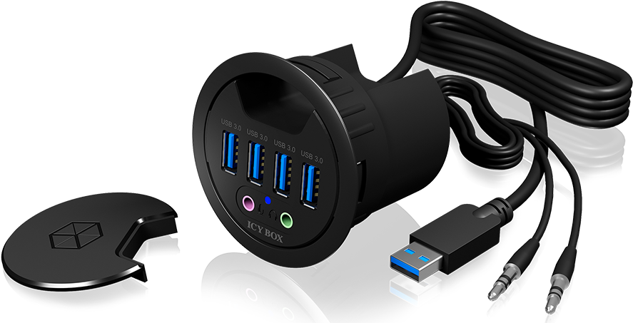 • ICY BOX IB-Hub1403a Tisch-Hub mit 4x USB 3.0 mit bis zu 5 Gbit/s und Audio Ein-/Ausgang Kabeldurchfuehrung fuer 60 cm (60303)