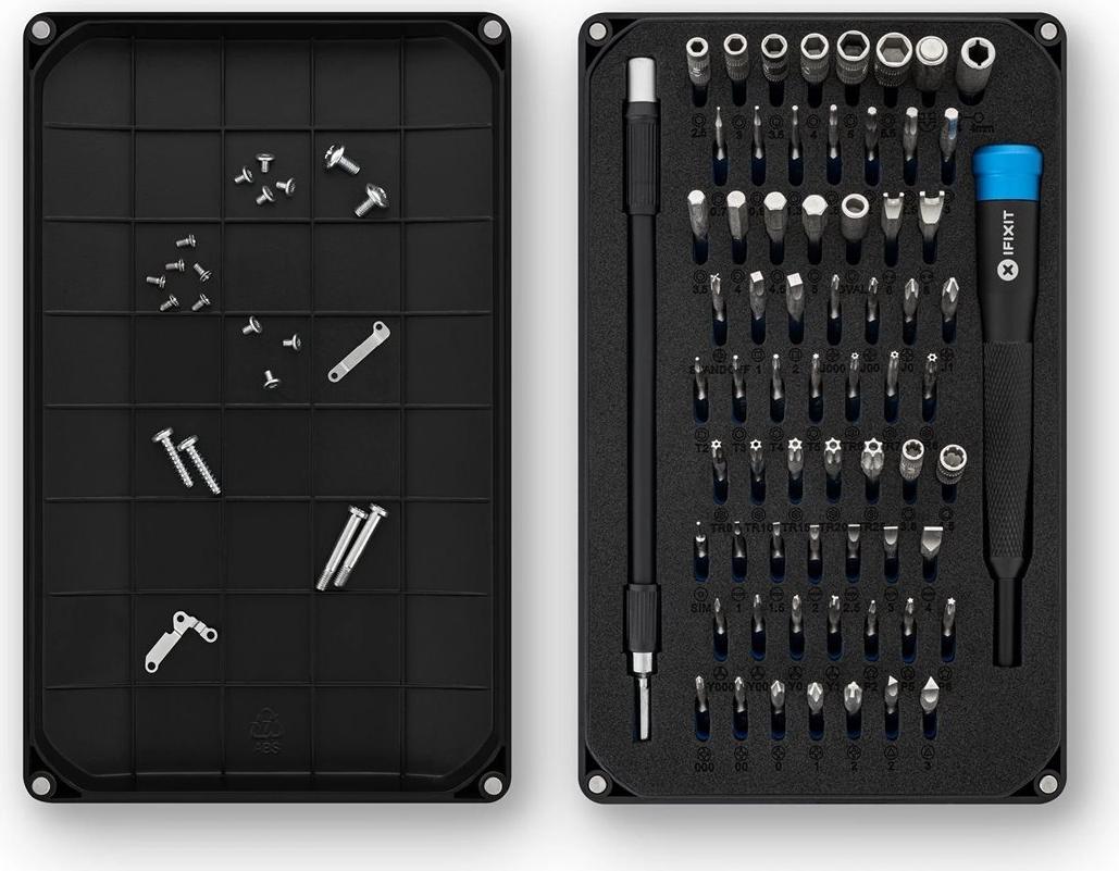 Ordentlich sortiert und transportabel verpackt, erhältst du nicht nur 64 verschiedene hochwertige und auf ihre Qualität geprüfte Bits für alle Schraubarbeiten - von Elektronikartikeln bis hin zu Möbeln. Natürlich enthält das Set auch den von iFixit entwickelten, ergonomisch geformten Schraubendreher. So umfangreich ausgerüstet bereitet dir keine Schraube mehr Kopfzerbrechen und du hast immer das exakt passende Bit zur Hand.