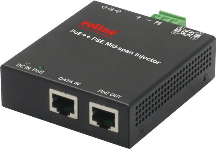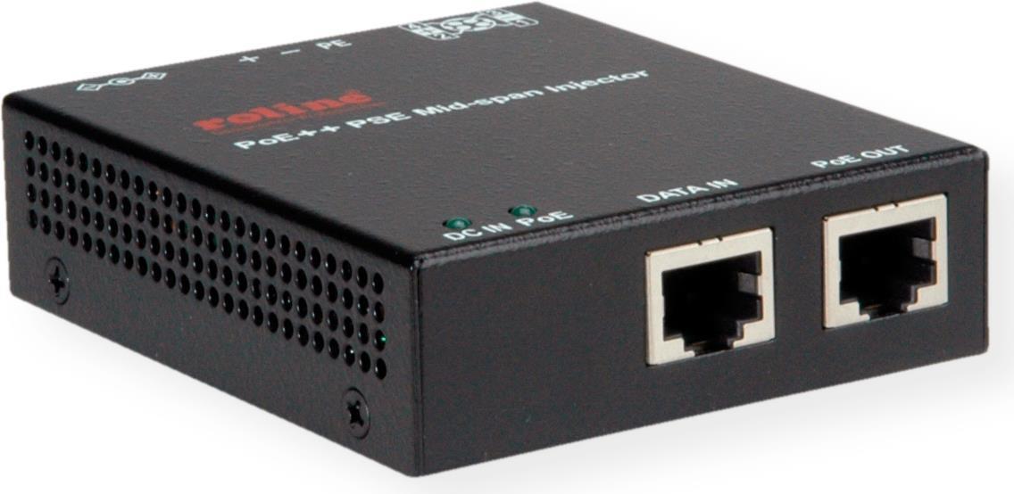 Der ROLINE Gigabit PoE++ Injektor ist ein sogenanntes PSE, ein Gerät zur Stromversorgung für z.B. Überwachungskameras und LAN-Geräte wie Access Points, Bridges und Router über Ethernet-Kabel. Ein PSE speist Strom zu den Daten in das Netzwerkkabel ein. Es muss dann kein eigenes Netzteil mehr an dem LAN-Gerät angeschlossen werden.