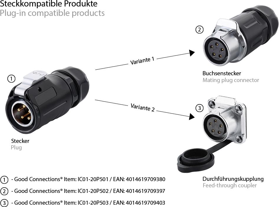 Industrie-Steckverbinder S1 - Power (5-Pin) Stecker mit Klick-Arretierung, Lötanschluss, M20, IP65/6 (IC01-20P501)