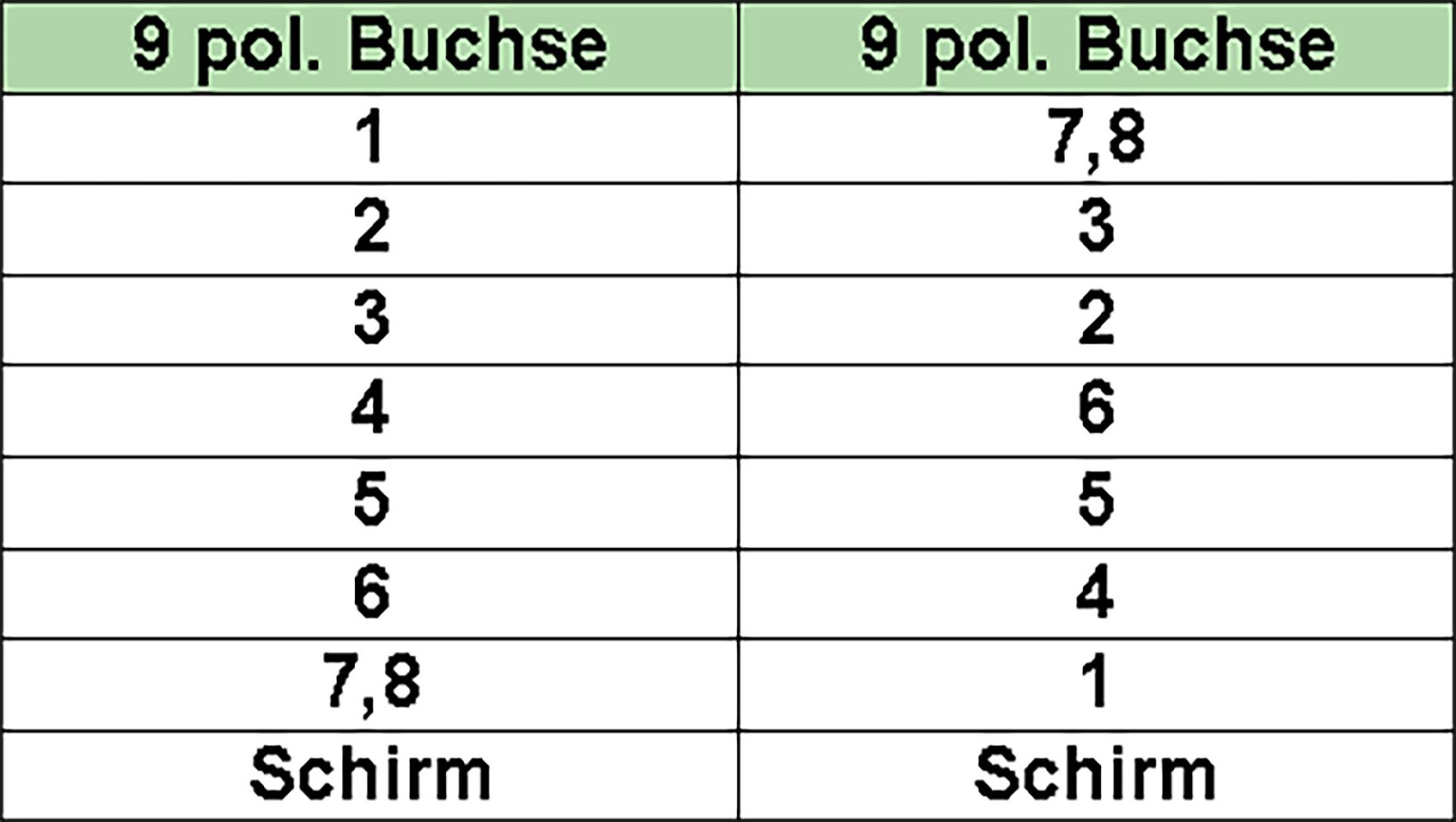 • Belegung: 1-7+8, 2-3, 3-2, 4-6, 5-5, 6-4, 7+8-1, Schirm-Schirm
