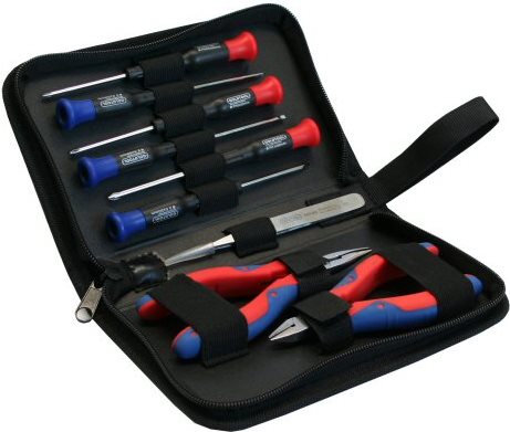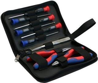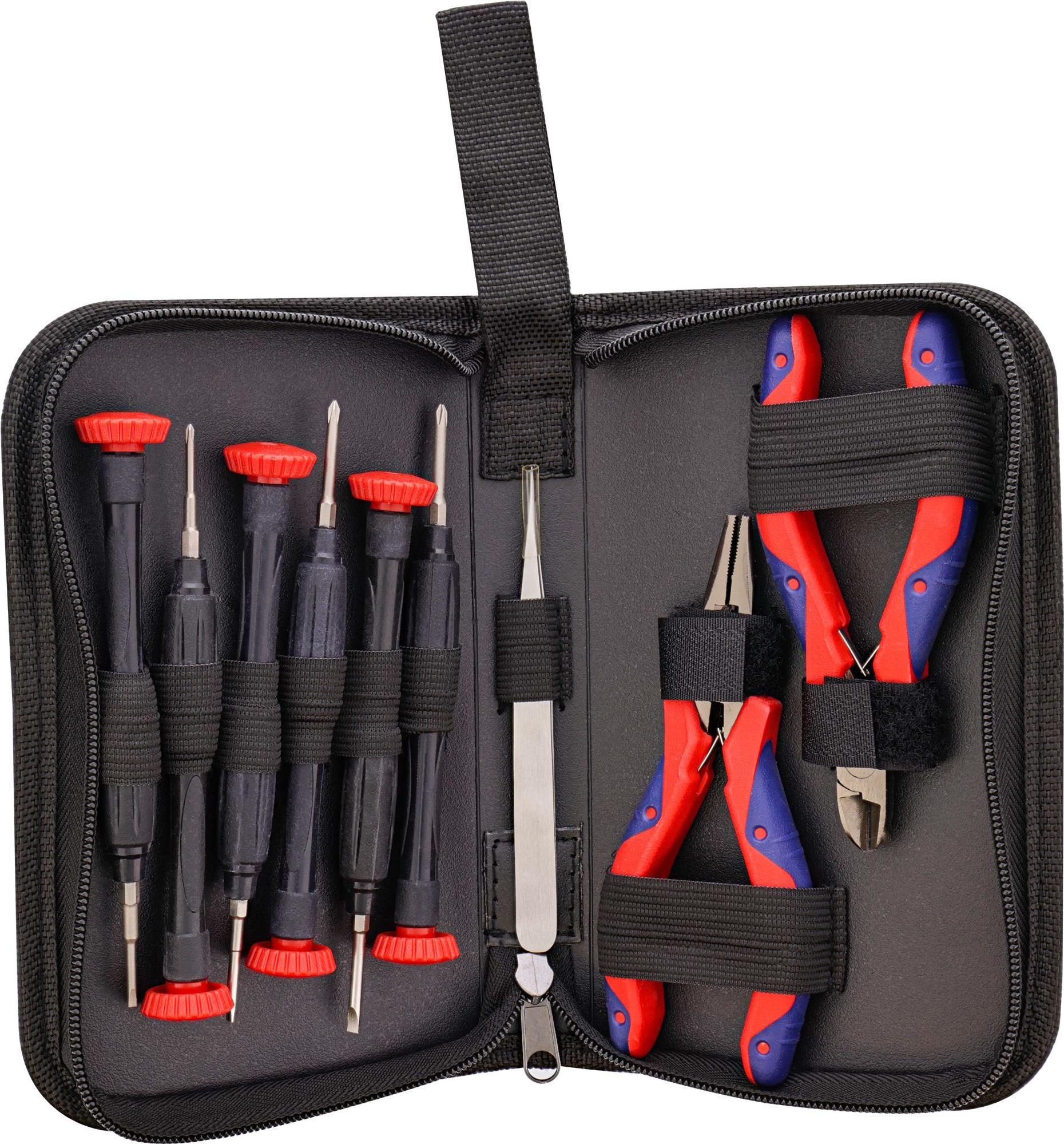 Das Werkzeugset für Computer und Elektronik besteht aus: • 3 Schlitz Schraubendreher, verschiedene Größen• 3 Kreuzschlitz Schraubendreher, verschiedene Größen• 1 Seitenschneider• 1 Spitzzange• 1 Pinzette