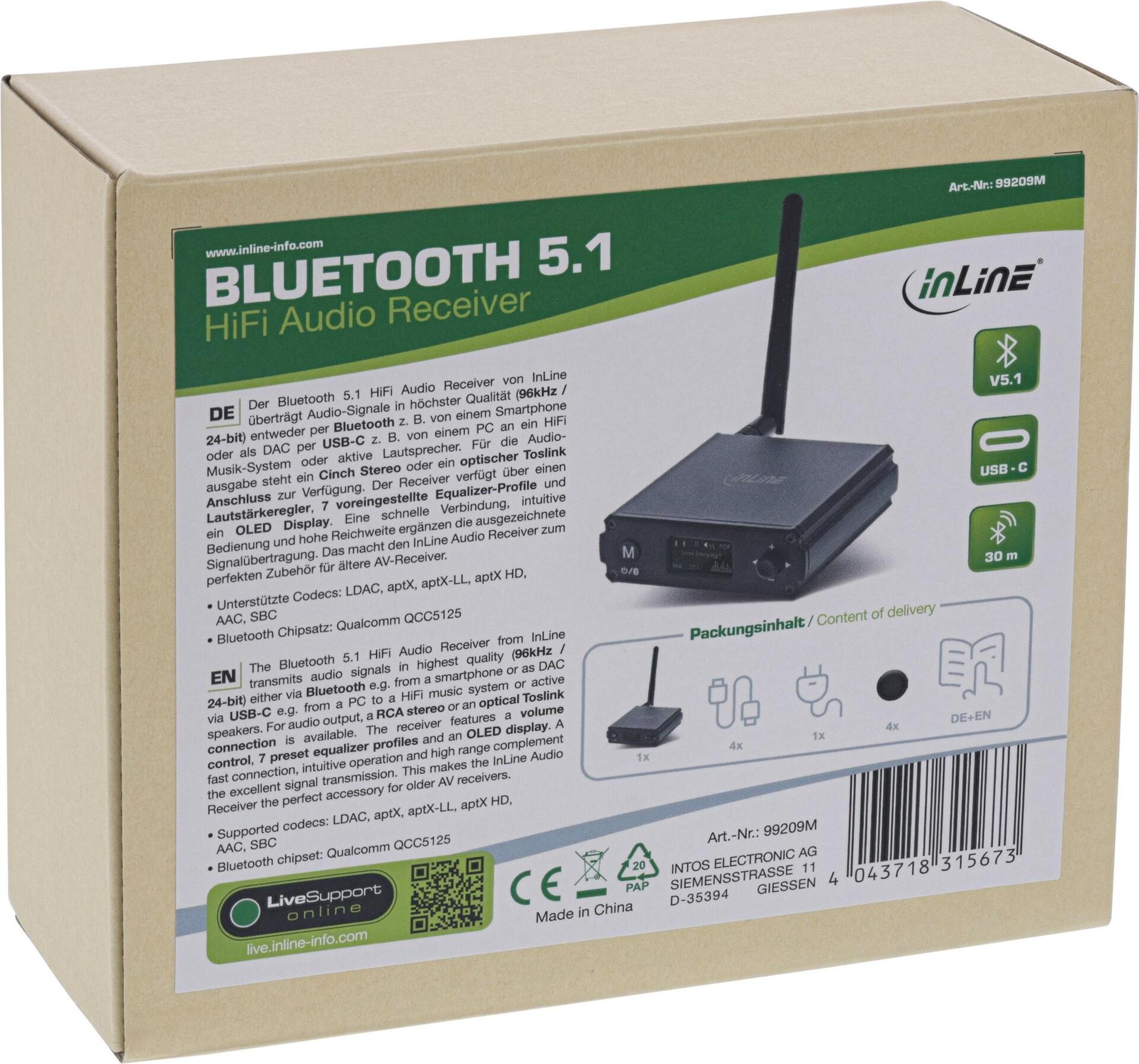 Der Bluetooth 5.1 HiFi Audio Receiver von InLine überträgt Audio-Signale in höchster Qualität (96kHz / 24-bit) entweder per Bluetooth z. B. von einem Smartphone oder als DAC per USB-C z. B. von einem PC an ein HiFi Musik-System oder aktive Lautsprecher. Für die Audioausgabe steht ein Cinch Stereo oder ein optischer Toslink Anschluss zur Verfügung. Der Receiver verfügt über einen Lautstärkeregler, 7 voreingestellte Equalizer-Profile und ein OLED Display. Eine schnelle Verbindung, intuitive Bedienung und hohe Reichweite ergänzen die ausgezeichnete Signalübertragung. Das macht den InLine Audio Receiver zum perfekten Zubehör für ältere AV-Receiver.• Bluetooth: Version 5.1 mit aptX HD• Bluetooth Chipsatz: Qualcomm QCC5125• Unterstützte Codecs: LDAC, aptX, aptX-LL, aptX HD, AAC, SBC• Bluetooth Reichweite: bis zu 30 Meter• Eingabe: Bluetooth, USB-C Audio• Ausgänge: Toslink optisch, 2x Cinch Analog Stereo• Stromversorgung: 5V DC / 0,08A über mitgeliefertes USB-Netzteil• Chinch Ausgang: 1.8 Vrms / 0dB• Harmonische Gesamtverzerrung + Rauschen (THD+N):• B-gewichtet: 0.02%/1KHz 0dB• Signal-Rausch-Verhältnis (SNR): -114dB• Dynamischer Bereich: -115dB• Crosstalk: -114dB• Equalizer-Modi: POP, BASS, CLASSIC, DANCE, JAZZ, ROCK, NORMAL• Abmessungen: ca. 8,89 x 7,62 x 2,54 cm (ohne Antenne)• D/A-Wandler: ES9018K2M SABRE32• PCM Unterstützung: 96kHz / 24-bit• OLED Display: 1\" einfarbig• Gehäuse: Aluminium• Farbe: SchwarzTechnische Eigenschaften Netzteil:• Eingangsspannung: 100-240V AC• Eingangswechselstromfrequenz: ~50/60 Hz• Ausgangsspannung: 5,0 V DC• Ausgangsstrom: max. 1,0 A• Ausgangsleistung: 5,0 W• Durchschnittliche Effizienz im Betrieb: 73.9 %• Leistungsaufnahme bei Nulllast: 0,06 WProdukttext[/head]Der Bluetooth 5.1 HiFi Audio Receiver von InLine überträgt Audio-Signale in höchster Qualität (96kHz / 24-bit) entweder per Bluetooth z. B. von einem Smartphone oder als DAC per USB-C z. B. von einem PC an ein HiFi Musik-System oder aktive Lautsprecher. Für die Audioausgabe steht ein Cinch Stereo oder ein optischer Toslink Anschluss zur Verfügung. Der Receiver verfügt über einen Lautstärkeregler, 7 voreingestellte Equalizer-Profile und ein OLED Display. Eine schnelle Verbindung, intuitive Bedienung und hohe Reichweite ergänzen die ausgezeichnete Signalübertragung. Das macht den InLine Audio Receiver zum perfekten Zubehör für ältere AV-Receiver.Bluetooth: Version 5.1 mit aptX HDBluetooth Chipsatz: Qualcomm QCC5125Unterstützte Codecs: LDAC, aptX, aptX-LL, aptX HD, AAC, SBCBluetooth Reichweite: bis zu 30 MeterEingabe: Bluetooth, USB-C AudioAusgänge: Toslink optisch, 2x Cinch Analog StereoStromversorgung: 5V DC / 0,08A über mitgeliefertes USB-NetzteilChinch Ausgang: 1.8 Vrms / 0dBHarmonische Gesamtverzerrung + Rauschen (THD+N): B-gewichtet: 0.02%/1KHz 0dBSignal-Rausch-Verhältnis (SNR): -114dBDynamischer Bereich: -115dBCrosstalk: -114dBEqualizer-Modi: POP, BASS, CLASSIC, DANCE, JAZZ, ROCK, NORMALAbmessungen: ca. 8,89 x 7,62 x 2,54 cm (ohne Antenne)D/A-Wandler: ES9018K2M SABRE32PCM Unterstützung: 96kHz / 24-bitOLED Display: 1\" einfarbigGehäuse: AluminiumFarbe: SchwarzTechnische Eigenschaften Netzteil:Eingangsspannung: 100-240V ACEingangswechselstromfrequenz: ~50/60 HzAusgangsspannung: 5,0 V DCAusgangsstrom: max. 1,0 AAusgangsleistung: 5,0 WDurchschnittliche Effizienz im Betrieb: 73.9 %Leistungsaufnahme bei Nulllast: 0,06 W[head]Hauptmerkmale