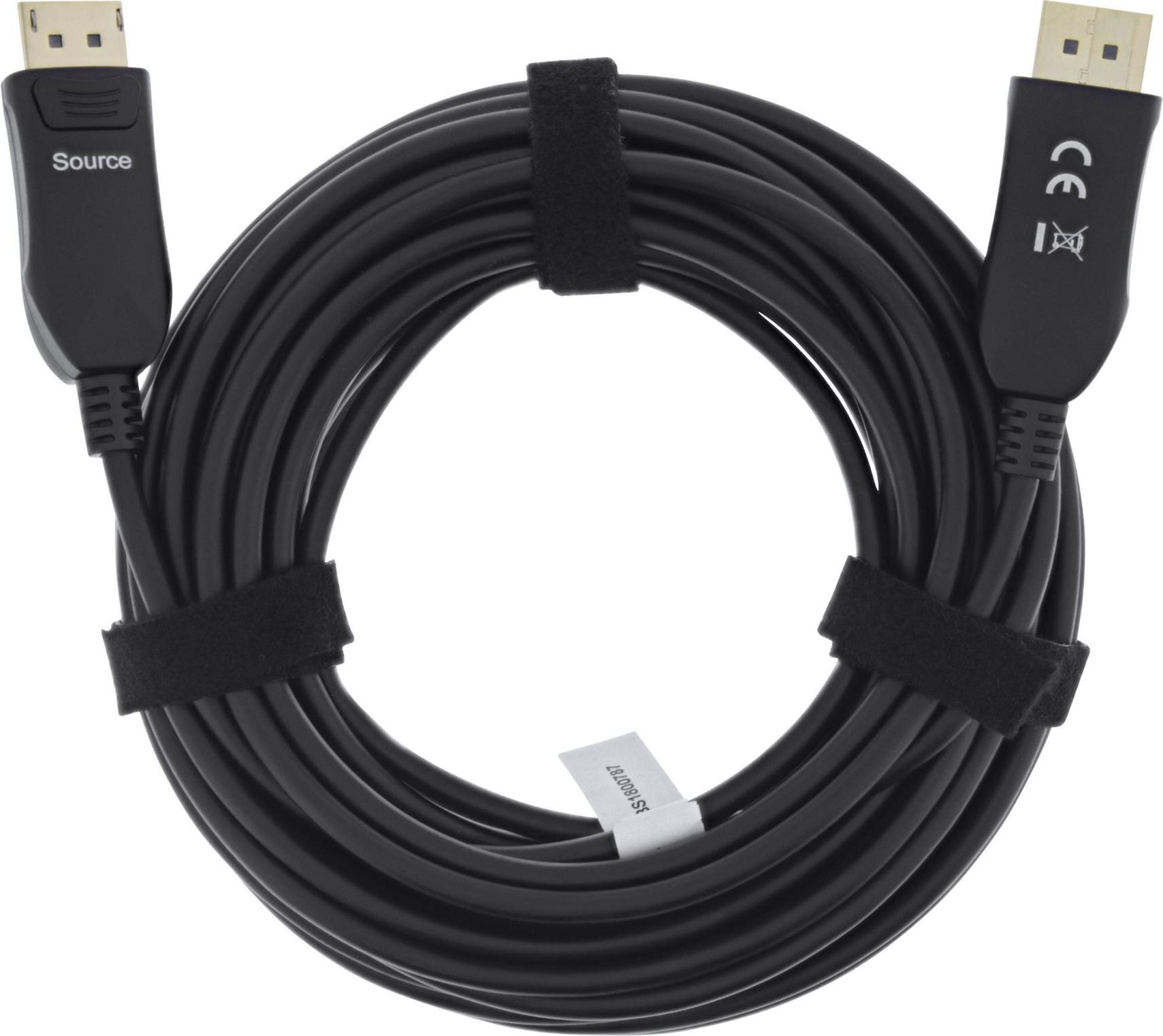 Das InLine® DisplayPort 2.1 AOC Kabel wurde für professionelle Ansprüche in IT-Umgebungen entwickelt, bei denen höchste Signalqualität und Zuverlässigkeit gefragt sind. Die Kombination aus aktiver optischer Technologie und hochwertiger Verarbeitung ermöglicht Datenübertragungsraten bis 54 Gb/s – ideal für grafikintensive Anwendungen wie CAD, Multimedia-Produktionen oder High-End-Präsentationssysteme.Das Hybridkabel verbindet vier Glasfasern und sieben Kupferadern für eine optimale Balance zwischen Reichweite und Leistung. Dank des richtungsgebundenen Designs mit robusten Metallsteckern ist eine sichere und stabile Verbindung möglich. Das Kabel unterstützt aktuelle Standards wie HDCP2.2, EDID und DPCP und ist vollständig abwärtskompatibel zu DisplayPort 1.4 und 1.2.Die schwarze TPU-Ummantelung mit aramidverstärkter Innenstruktur schützt das Kabel effektiv vor Abnutzung und mechanischer Belastung. Die Installation erfolgt unkompliziert über Plug & Play, ohne zusätzliche Konfiguration. Ideal für den Einsatz in Konferenzräumen, Kontrollzentren, Industrieanlagen oder IT-Infrastrukturen.• Hybridkabel mit 4 Glasfasern & 7 Kupferlitzen