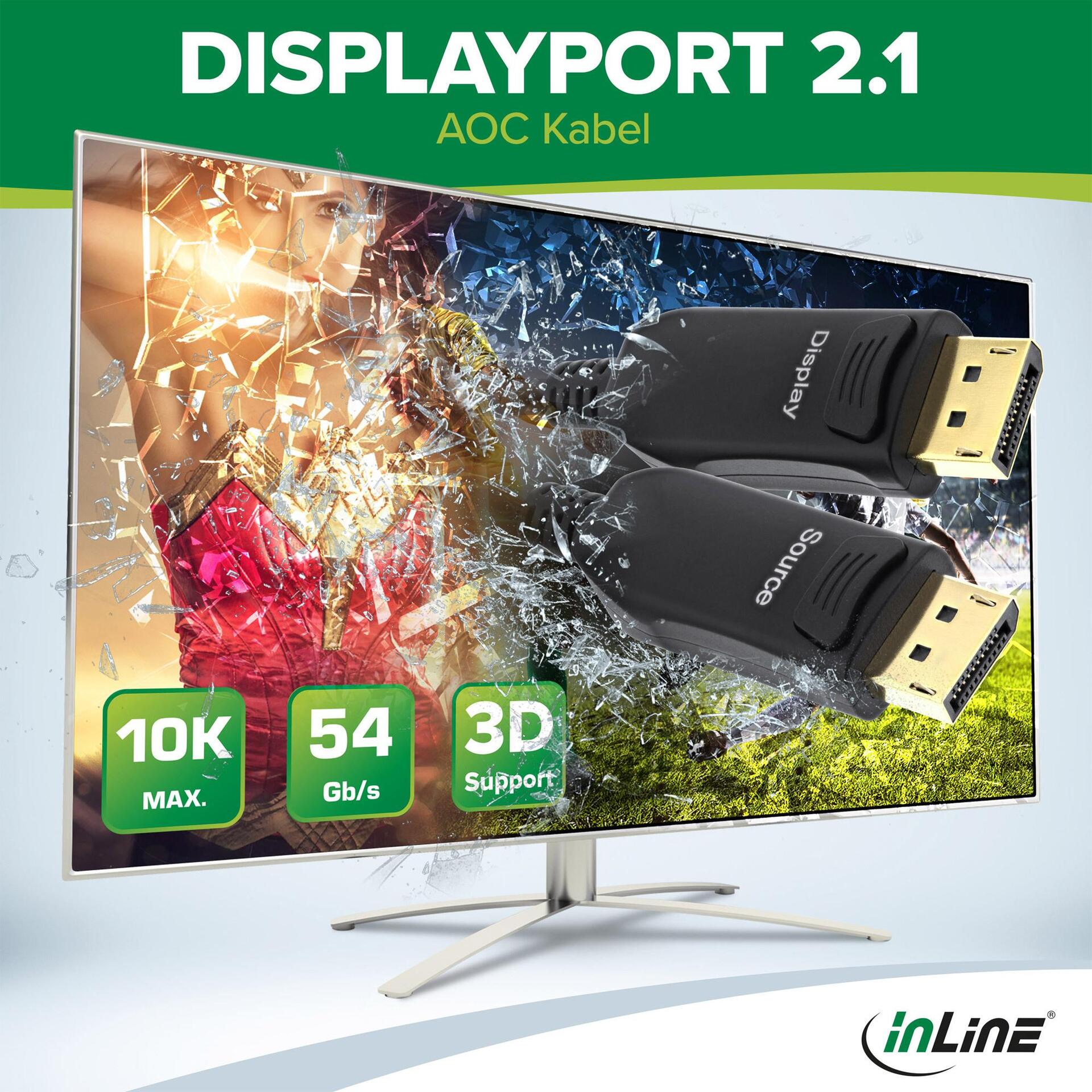 Das InLine® DisplayPort 2.1 AOC Kabel wurde für professionelle Ansprüche in IT-Umgebungen entwickelt, bei denen höchste Signalqualität und Zuverlässigkeit gefragt sind. Die Kombination aus aktiver optischer Technologie und hochwertiger Verarbeitung ermöglicht Datenübertragungsraten bis 54 Gb/s – ideal für grafikintensive Anwendungen wie CAD, Multimedia-Produktionen oder High-End-Präsentationssysteme.Das Hybridkabel verbindet vier Glasfasern und sieben Kupferadern für eine optimale Balance zwischen Reichweite und Leistung. Dank des richtungsgebundenen Designs mit robusten Metallsteckern ist eine sichere und stabile Verbindung möglich. Das Kabel unterstützt aktuelle Standards wie HDCP2.2, EDID und DPCP und ist vollständig abwärtskompatibel zu DisplayPort 1.4 und 1.2.Die schwarze TPU-Ummantelung mit aramidverstärkter Innenstruktur schützt das Kabel effektiv vor Abnutzung und mechanischer Belastung. Die Installation erfolgt unkompliziert über Plug & Play, ohne zusätzliche Konfiguration. Ideal für den Einsatz in Konferenzräumen, Kontrollzentren, Industrieanlagen oder IT-Infrastrukturen.• Hybridkabel mit 4 Glasfasern & 7 Kupferlitzen