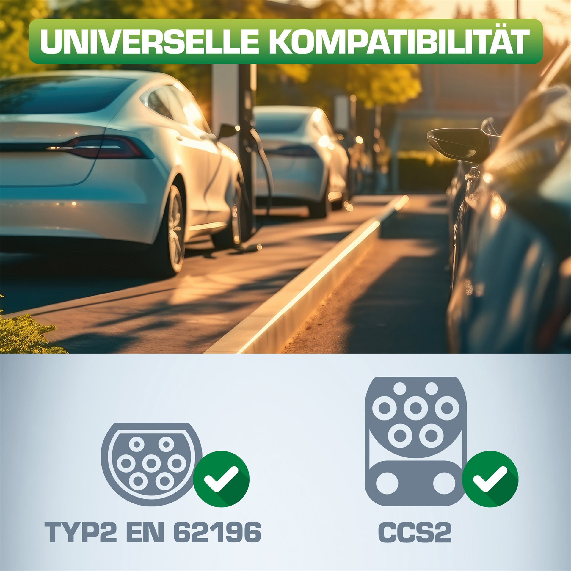 • Geeignet für Elektrofahrzeuge und Plug-in-Hybride mit Typ 2 und CCS2 Ladeeingängen, NICHT kompatibel mit Typ 1, CCS1, CHAdeMO, TESLA Supercharger und GB/T-Ladepunkten.