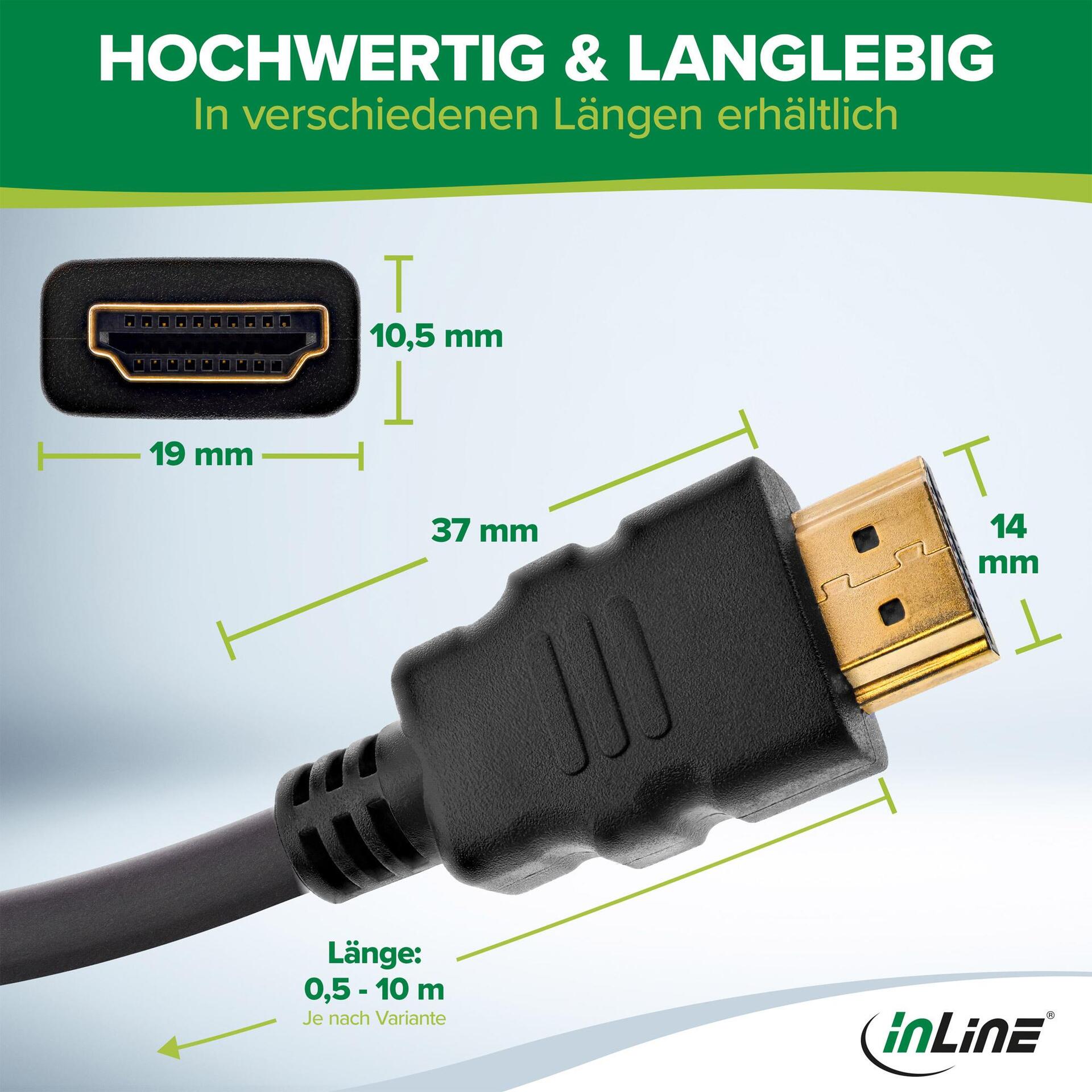 • Optimales Preis-Leistungs-Verhältnis: Kosteneffiziente Alternative mit bis zu 50 % Ersparnis gegenüber Premium-Kabeln.• Für feste Installationen geeignet: Ideal für Arbeitsplätze, Konferenzräume oder Heimkinos, wo das Kabel dauerhaft verlegt bleibt.• Längenabhängige Performance: HDMI 2.0 mit 4k@60Hz bis 5m, ab 7,5m 4K@30Hz.• Flexibel & robust: Mehrlitzen-Aufbau sorgt für Widerstandsfähigkeit gegen Bewegungen.• Beeindruckenden Übertragungsrate von bis zu 18 Gb/s.Die neue InLine® HDMI-Kabelserie mit CCS-Leitermaterial bietet eine kosteneffiziente Alternative zu klassischen Kupferkabeln, ohne auf bewährte Qualität verzichten zu müssen. Entwickelt für feste Installationen, sind diese Kabel ideal für Büros, Konferenzräume oder Heimkinos geeignet, wo die Kabel einmal verlegt werden und dort verbleiben.Durch den Einsatz von kupferkaschiertem Stahl (CCS) anstelle von Vollkupfer ergibt sich eine signifikante Preisersparnis von ca. 50 % im Vergleich zur Premium-Serie. Während HDMI 2.0 bis zu einer Länge von 5m voll unterstützt wird, ist ab 7,5m eine maximale Auflösung von 4K@30Hz gewährleistet.Dank des Mehrlitzen-Aufbaus bleibt das Kabel flexibel und widerstandsfähig gegenüber mechanischer Beanspruchung. Dank einer Gesamtschirmung, vergoldeter HDMI-Kontakte und einem Twisted-Pair-Aufbau erleben Sie eine zuverlässige Signalübertragung und optimale Abschirmung. Mit einem PVC-Mantel und stabilen Steckerkontakten ist das HDMI-Kabel langlebig und zuverlässig.Diese Kabel sind ideal für Systemhäuser und Wiederverkäufer, die ihren Kunden eine kostengünstige und dennoch leistungsstarke Lösung z. B. für die Ausstattung von Arbeitsplätzen anbieten möchten.HDMI 2.0b:Dieses InLine HDMI-Kabel der Spezifikation 2.0b unterstützt bis zu einer Länge von 5m Ultra High Definition (UHD) und 4K-Videoübertragung mit bis zu 60 Bildern pro Sekunde. Das bedeutet eine bessere Bildqualität mit einer breiteren Farbpalette und einem größeren Kontrastumfang im Vergleich zur Vorgängerversion. Damit ist dieses Kabel speziell für die Wiedergabe von hochauflösende Audio- und Videoinhalte mit schnellen Bewegungen geeignet. Das InLine HDMI-Kabel überträgt dabei zuverlässig das Signal von geeigneten HDMI-Quellen wie Kabel- oder Satelliten-Receivern, Streaming-Geräten, Spielekonsolen, Computern und Gaming-PCs, AV-Receivern und Kameras zu passenden HDMI-Ausgabegeräten wie 4k Beamern, UHD Smart-TVs und 4k Gaming-Monitoren.Technische Spezifikationen:• HDMI-Version: 2.0 (bis 5m)• Auflösung: Bis 4K@60Hz (bis 5m), 4K@30Hz (ab 7,5m)• Material: CCS-Leitermaterial, Mehrlitzen-Aufbau, 30AWG Adern• Schirmung: Gesamtabschirmung• Twisted-Pair-Aufbau für beste Abschirmung intern• Mantel: PVC• Steckerkontakte: Vergoldet• Länge: 0,5m – 10m verfügbarProdukttext[/head]Optimales Preis-Leistungs-Verhältnis: Kosteneffiziente Alternative mit bis zu 50 % Ersparnisgegenüber Premium-Kabeln.Für feste Installationen geeignet: Ideal für Arbeitsplätze, Konferenzräume oder Heimkinos, wo das Kabel dauerhaft verlegt bleibt.Längenabhängige Performance: HDMI 2.0 mit 4k@60Hzbis 5m, ab 7,5m 4K@30Hz.Flexibel & robust: Mehrlitzen-Aufbau sorgt für Widerstandsfähigkeit gegen Bewegungen.Beeindruckenden Übertragungsratevon bis zu 18 Gb/s.Die neue InLine® HDMI-Kabelserie mit CCS-Leitermaterial bietet eine kosteneffiziente Alternativezu klassischen Kupferkabeln, ohne auf bewährte Qualität verzichten zu müssen. Entwickelt für feste Installationen, sind diese Kabel ideal für Büros, Konferenzräume oder Heimkinos geeignet, wo die Kabel einmal verlegt werden und dort verbleiben.Durch den Einsatz von kupferkaschiertem Stahl (CCS)anstelle von Vollkupfer ergibt sich eine signifikante Preisersparnis von ca. 50 %im Vergleich zur Premium-Serie. Während HDMI 2.0 bis zu einer Länge von 5m voll unterstütztwird, ist ab 7,5m eine maximale Auflösung von 4K@30Hzgewährleistet.Dank des Mehrlitzen-Aufbausbleibt das Kabel flexibel und widerstandsfähig gegenüber mechanischer Beanspruchung. Dank einer Gesamtschirmung, vergoldeter HDMI-Kontakte und einem Twisted-Pair-Aufbau erleben Sie eine zuverlässige Signalübertragung und optimale Abschirmung. Mit einem PVC-Mantel und stabilen Steckerkontaktenist das HDMI-Kabel langlebig und zuverlässig.Diese Kabel sind ideal für Systemhäuser und Wiederverkäufer, die ihren Kunden eine kostengünstige und dennoch leistungsstarke Lösung z. B. für die Ausstattung von Arbeitsplätzen anbieten möchten.HDMI 2.0b:Dieses InLine HDMI-Kabel der Spezifikation 2.0b unterstützt bis zu einer Länge von 5m Ultra High Definition (UHD) und 4K-Videoübertragung mit bis zu 60 Bildern pro Sekunde. Das bedeutet eine bessere Bildqualität mit einer breiteren Farbpalette und einem größeren Kontrastumfang im Vergleich zur Vorgängerversion. Damit ist dieses Kabel speziell für die Wiedergabe von hochauflösende Audio- und Videoinhalte mit schnellen Bewegungen geeignet. Das InLine HDMI-Kabel überträgt dabei zuverlässig das Signal von geeigneten HDMI-Quellen wie Kabel- oder Satelliten-Receivern, Streaming-Geräten, Spielekonsolen, Computern und Gaming-PCs, AV-Receivern und Kameras zu passenden HDMI-Ausgabegeräten wie 4k Beamern, UHD Smart-TVs und 4k Gaming-Monitoren.Technische Spezifikationen:HDMI-Version: 2.0 (bis 5m)Auflösung: Bis 4K@60Hz (bis 5m), 4K@30Hz (ab 7,5m)Material: CCS-Leitermaterial, Mehrlitzen-Aufbau, 30AWG AdernSchirmung: GesamtabschirmungTwisted-Pair-Aufbau für beste Abschirmung internMantel: PVCSteckerkontakte: VergoldetLänge: 0,5m – 10m verfügbar[head]Hauptmerkmale