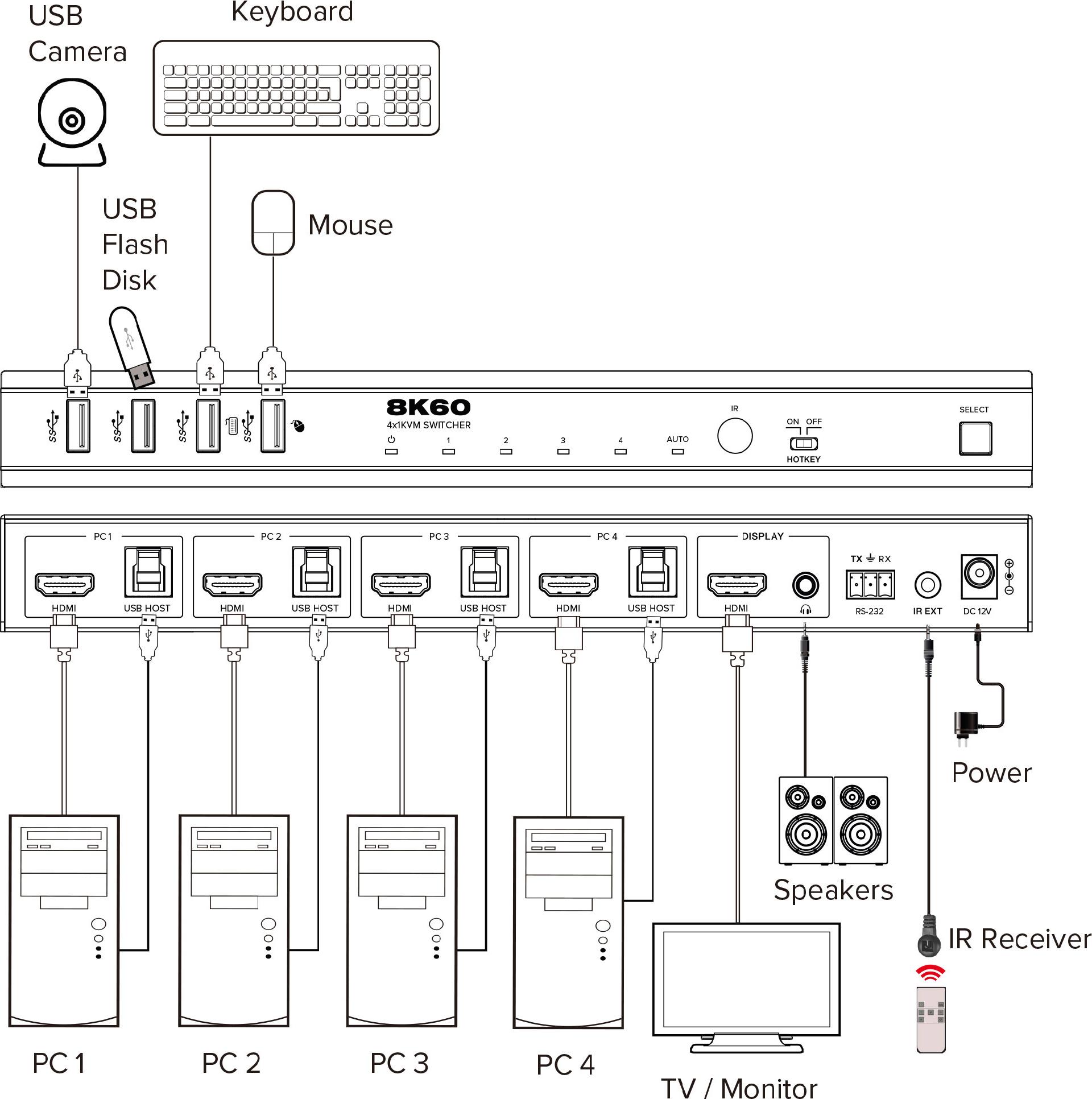 InLine KVM Switch - 4-fach - HDMI - 8K@60Hz - USB 3.2 - mit IR & RS-232 (57885D)