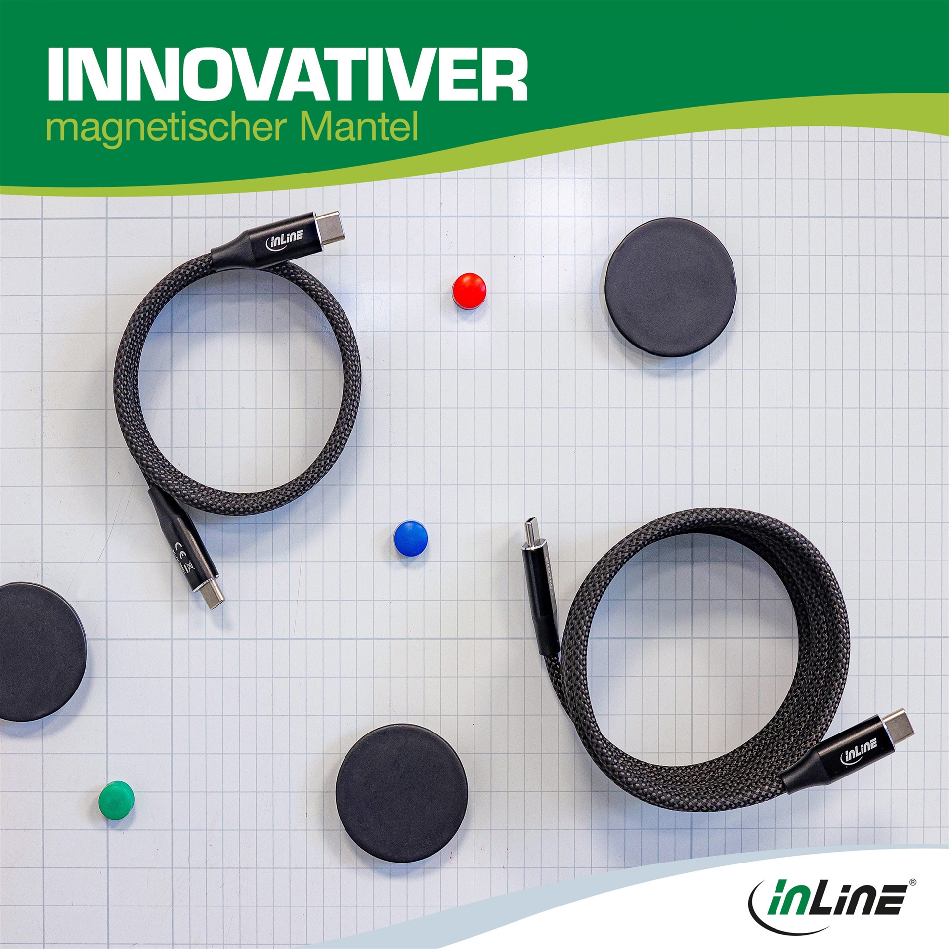Das InLine® MAGNETIC USB-C Kabel ist das perfekte Kabel zum schnellen Aufladen Ihres Smartphones oder Tablets mit USB-C Ladebuchse. Der magnetische Mantel des Kabels fungiert als clevere Lösung, um das Kabel ordentlich aufzurollen und ermöglicht eine flexible Anpassung auf nahezu jede gewünschte Kabellänge. Außerdem wird lästiger Kabelsalat verhindert und durch die Haftung an metallischen Oberflächen kann dies bei der Aufbewahrung oder der leibt z.B. auf dem Schreibtisch oder in der Notebooktasche stets alles aufgeräumt.• USB-C Schnellladekabel bis 100 W