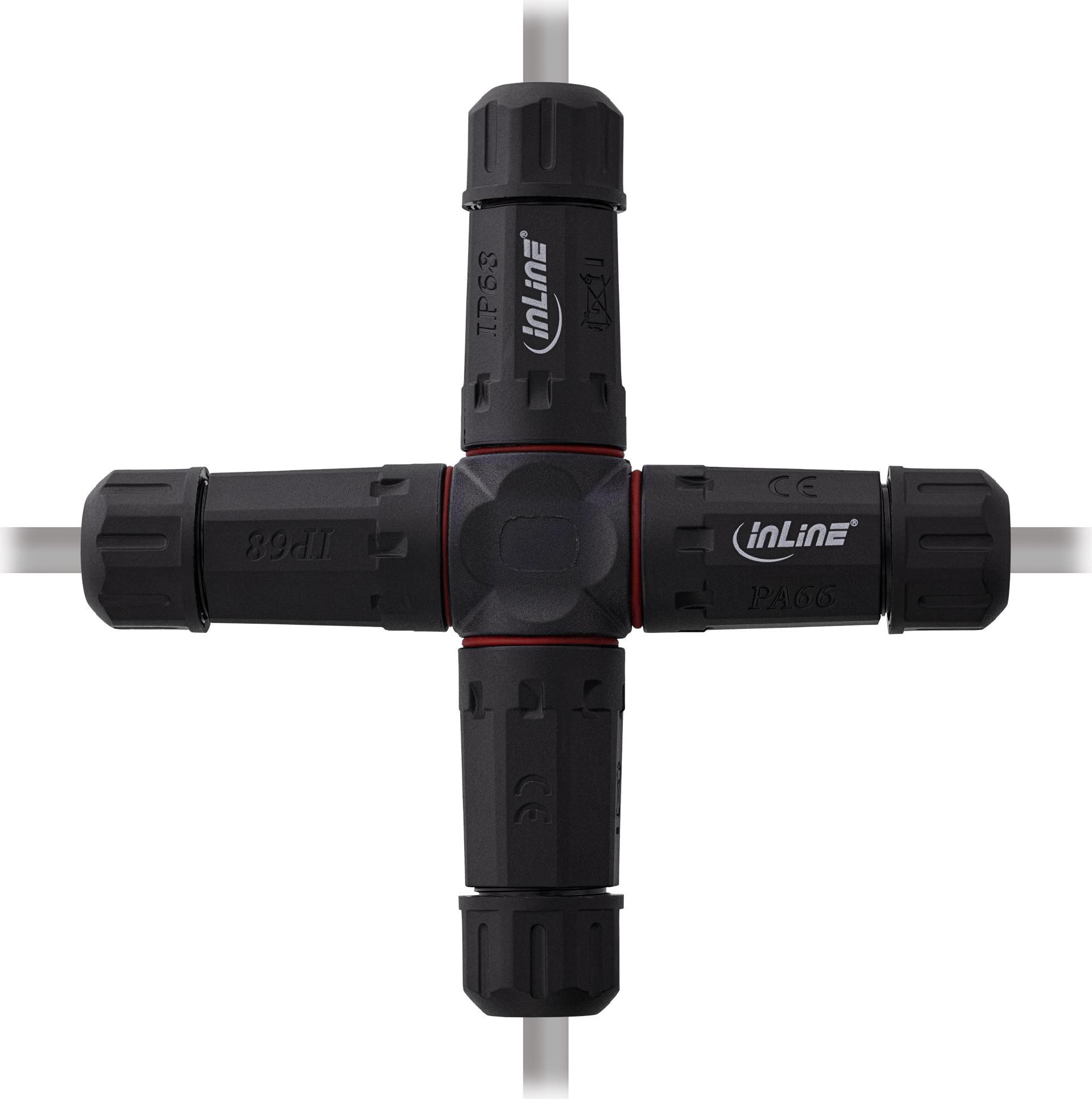 • InLine Netzkabelkupplung IP68 3-polig 4-Wege M20 schwarz (69927V)