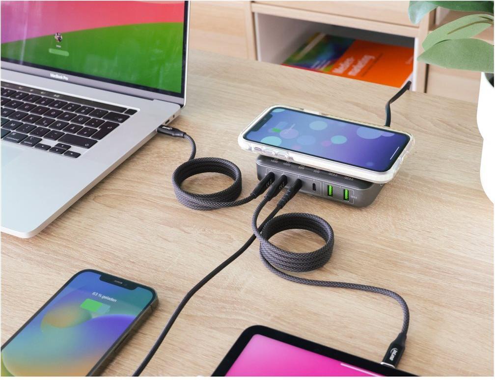 Die InLine® Qi Powerstation Multiport ist ein Schnellladenetzteil für bis zu sechs PD/QC kompatible USB-Endgeräte sowie ein weiteres über Wireless Charging, die zeitgleich geladen werden können, z.B. kompatibel zum iPhone, iPad und anderen mobilen Geräten. Herkömmliche Endgeräte können ebenfalls mit diesem Netzteil aufgeladen werden, benötigen allerdings länger, bis sie vollständig wieder geladen sind.• 6-Port USB Typ-C / Typ-A Netzteil/Ladegerät, Desktop-Version• Netzteil basierend auf GaN-Technologie: mehr Leistung bei geringeren Abmessungen• USB Typ-C PD-Ausgang 1 und 2: 5,0VDC/3,0A - 9,0VDC/3,0A - 12,0VDC/3,0A - 15,0VDC/3,0A - 20,0VDC/5,0A (max. 100,0W)• USB Typ-C PD-Ausgang 3 und 4: 5,0VDC/3,0A - 9,0VDC/3,0A - 12,0VDC/2,5A - 15,0VDC/2,0A - 20,0VDC/1,5A (max. 30,0W)• USB Typ-A QC-Ausgang 1 und 2: 5,0VDC/3,0A - 9,0VDC/3,0A - 12,0VDC/2,5A - 20,0VDC/1,5A (max. 30,0W)• Power Delivery 2.0, 3.0 und Quick Charge 2.0, 3.0 kompatibel• Ausgangsleistung Wireless Charging: 5,0W / 7,5W / 15,0W• max. Gesamt-Ausgangsleistung: 100,0W• Überspannungs- und Kurzschlussschutz• Temperaturschutz: Bei zu hoher Temperatur des Netzteils schaltet es automatisch ab und setzt nach Abkühlung das Laden automatisch fort• Eingangsspannung: 100-240V AC• Eingangswechselstromfrequenz: ~50/60 Hz, 2,5 A• Ausgangsspannung: 5,0-20,0 V DC• Ausgangsstrom: max. 5,0 A• Ausgangsleistung: 100,0 W• Durchschnittliche Effizienz im Betrieb: 83,30 % (USB-C 5,0V/3,0A), 84,54% (USB-C 12,0V/1,5A), 82,05 % (USB-A 5,0V/3,0A), 83,02 % (USB-A 12,0V/1,5A)• Leistungsaufnahme bei Nulllast: 0,07 W• Abmessungen (LxBxH): ca. 120x85x29mm• Gewicht: ca. 310g• Inkl. Netzkabel, 1,8mGaN (Galliumnitrid) Netzteile - Schneller, kleiner, besser!GaN Netzteile sind hocheffiziente Ladegeräte mit mehr Leistung bei geringerem Platzbedarf.• Elektronen werden bis zu 1.000x effizienter geleitet als bei Silizium-Halbleitern• Geringere Wärmeentwicklung bei der Stromübertragung = weniger Energieverlust• Weniger Komponenten erforderlich = kleinere Bauform mit mehr PortsStatus LED• Im Bereitschaftszustand leuchtet die LED orange• Wird ein Gerät per Wireless Charging geladen, blinkt die LED langsam in blau• Bei einer Fremdkörpererkennung auf der Wireless Charging Fläche blinkt die LED schnell in blau