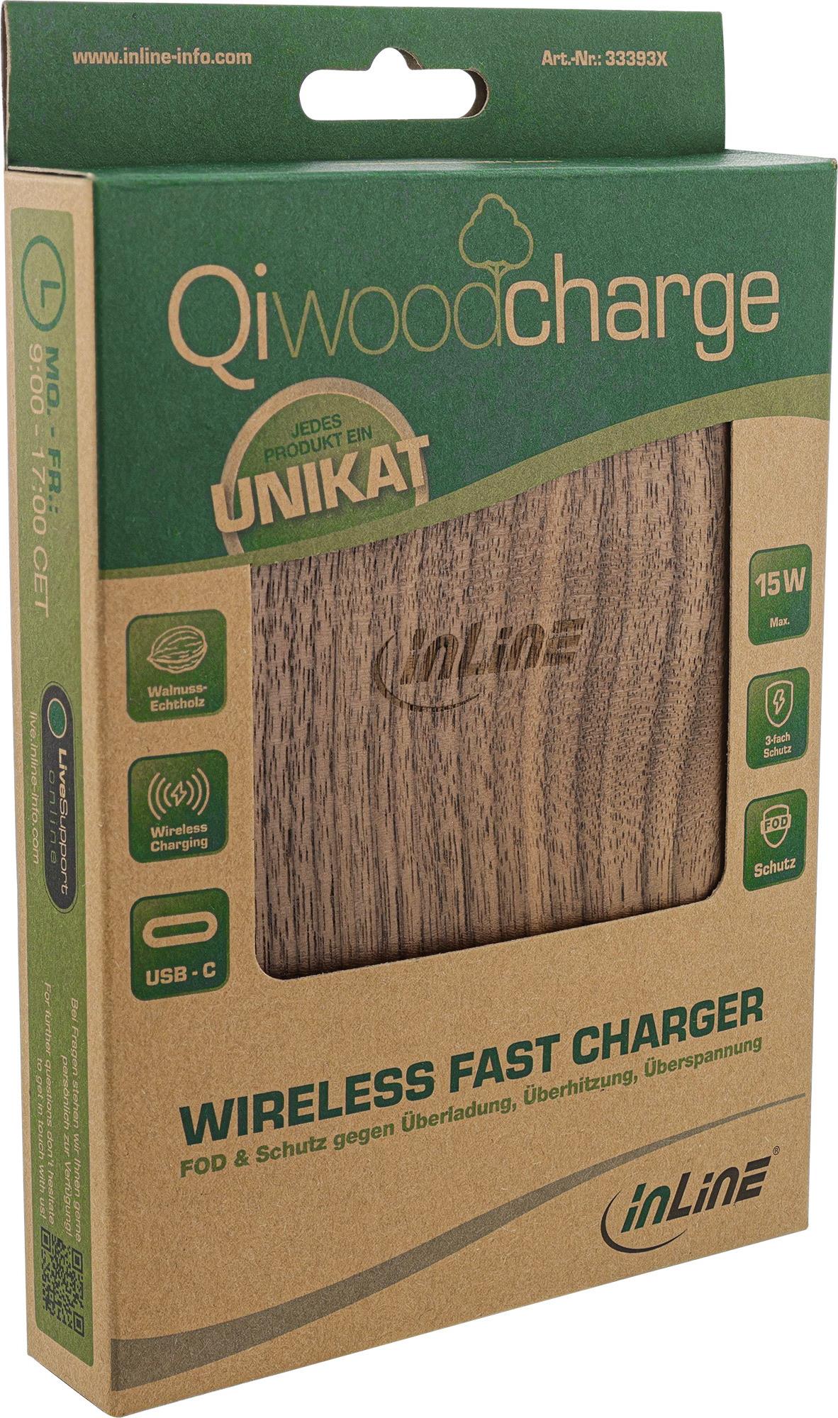 InLine® Qi woodcharge, wireless fast charger, Smartphone kabellos laden, 5/7,5/10W/15W, Typ-C (33393X)