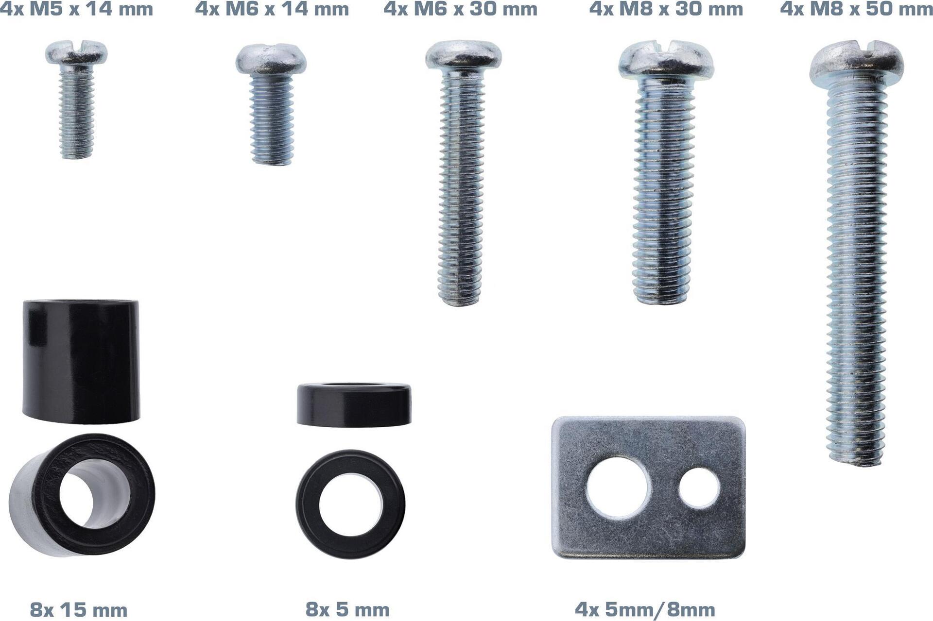 Das Schraubenset dient als Ersatzteil-Set für fehlende Schrauben und Unterlegscheiben zur Montage von Flachbildfernseher an die Wandhalterung. Packungsinhalt:• Kreuzschlitz-Schrauben: 4x M5x14mm, 4x M6x14mm, 4x M6x30mm, 4x M8x30mm, 4x M8x50mm• 4x Unterlegplatte mit Doppelloch 5mm/8mm• Abstandshalter mit 8mm Innen- und 15mm Außendurchmesser: 8x 5mm, 8x 15mm