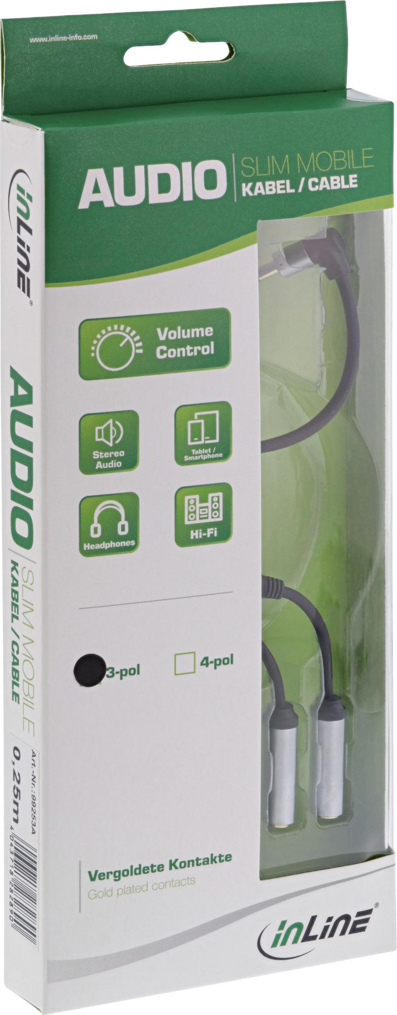 InLine® Slim Audio Y-Kabel Klinke 3,5mm Stecker gewinkelt an 2x Klinke Buchse, mit Lautstärkeregler, 0,25m (99253A)