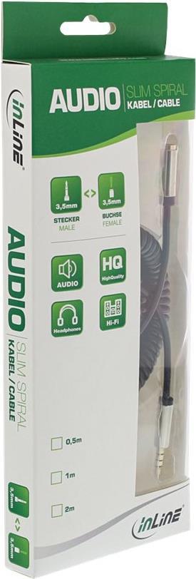Perfekt, um auf jeder Reise Musik zu hören!Ob im Auto, in der Bahn, beim Training oder auf einem Ausflug mit Freunden, die InLine® Slim Audio Cables sind Ihr idealer Begleiter. Diese extra dünnen, hochflexiblen Kabel sind mit platzsparenden Slimline-Steckern ausgestattet. Genießen Sie Freiheit ohne Kompromisse bei der Klangqualität. Reine Kupferfäden und vergoldete Stecker sorgen für die beste Leistung Ihrer persönlichen Geräte. Die spezielle Spiralform des Kabels eignet sich für alle Anwendungen, die eine kurzzeitige Kabelverlängerung und ein geringes Volumen bei Nichtgebrauch erfordern.• Extra dünnes und flexibles Slim Audio-Verlängerungskabel in mobiler Qualität (spiralförmig)• Klinke 3,5mm Stecker auf Klinke 3,5mm Buchse• 4-polige Trichannel-Klinkenstecker für Stereosignale• Robuste, schlanke, vernickelte Metallstecker mit vergoldeten Kontakten• Kabelwendel aus reinem Kupfer für verbesserte Signalqualität• Flexibles schwarzes PVC-Rundkabel, 15 % gewickelt für maximale Bewegungsfreiheit ohne Qualitätsverluste