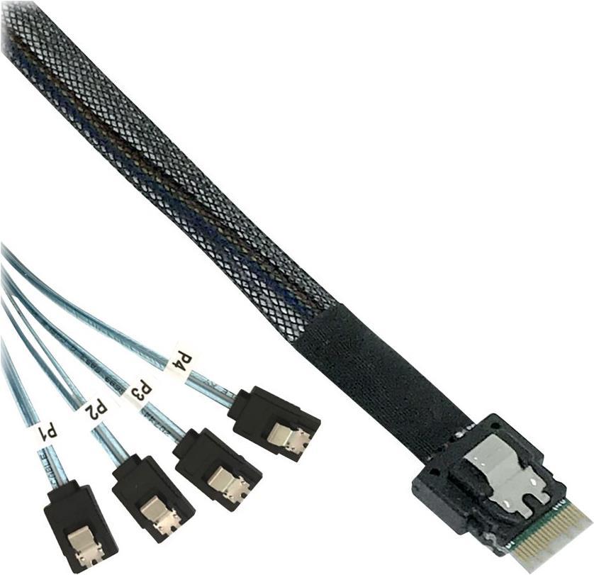 InLine® Slim SAS Kabel zum Verbinden von (internen) SAS Geräten wie z. B. Festplatten an den Controller (HBA-Karten, RAID-Controller, JBOD, DAS, SANS)• Slim SAS 4i Stecker SFF-8654 an 4x SATA 7-pin Stecker