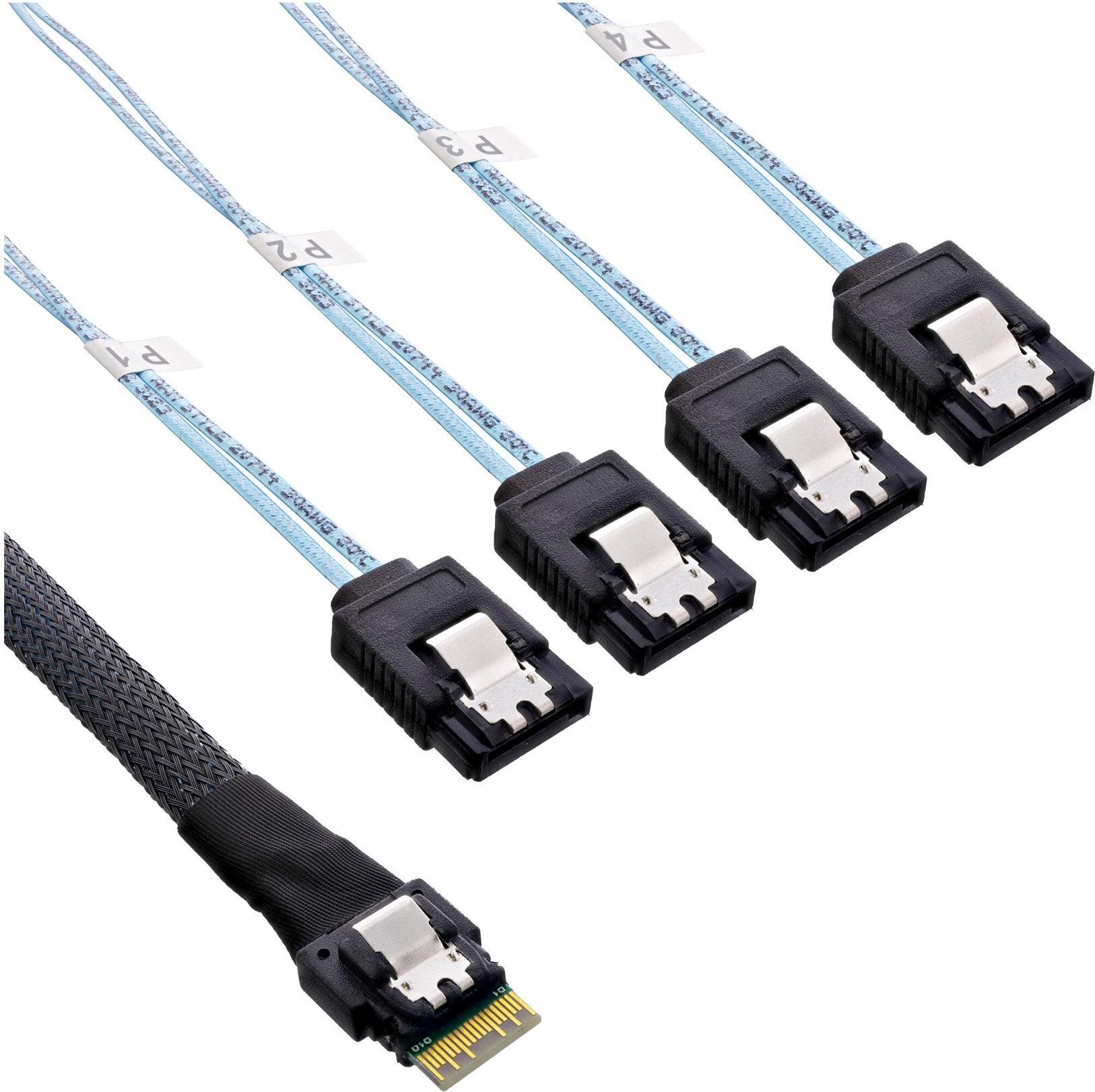InLine® Slim SAS Kabel zum Verbinden von (internen) SAS Geräten wie z. B. Festplatten an den Controller (HBA-Karten, RAID-Controller, JBOD, DAS, SANS)• Slim SAS 4i Stecker SFF-8654 an 4x SATA 7-pin Stecker