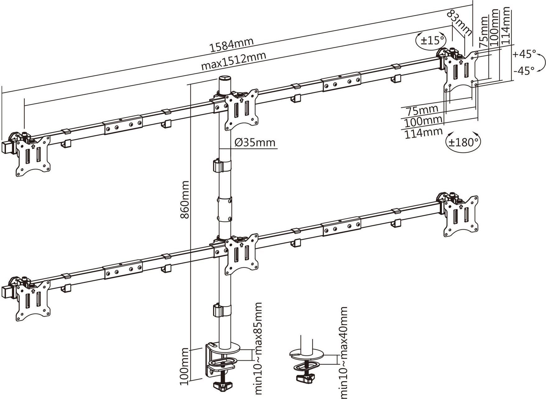 • Höhenverstellbar bis ca. 86 cm (3 Monitore auf je 2 Ebenen)