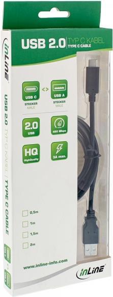 InLine® High Speed USB 2.0 Kabel mit Typ-C Stecker – für zuverlässige Datenübertragung und sicheres LadenDieses High-Speed-Kabel mit USB-Typ-C-Stecker bietet Ihnen eine praktische und moderne Lösung für den Anschluss Ihrer Geräte. Der reversible Typ-C-Stecker lässt sich unabhängig von der Ausrichtung einstecken und erleichtert so den Alltag.• Vielseitige Nutzung: Ideal als Ladekabel für Smartphones, Tablets und andere Geräte mit USB-C-Anschluss.• Zukunftssicherer Standard: USB-C ist der Ladestandard der nächsten Generation, kompatibel mit einer Vielzahl von Geräten und Anwendungen.• Hochwertige Verarbeitung: Robustes Design für eine zuverlässige Datenübertragung und sicheres Laden über Jahre hinweg.• Stabile Datenübertragung: Unterstützt USB 2.0-Datenraten bis zu 480Mb/s, ausreichend für alltägliche Anwendungen wie Synchronisation und Backup.• Effiziente Energieübertragung: USB Power Delivery mit bis zu 3A auf Strecken bis zu 1m und 0,5A bis zu 5m sorgt für schnelles und sicheres Laden.Technische Details:• USB-C-Stecker auf USB-A-Stecker• Entspricht den USB 2.0-Spezifikationen• Geeignet für externe USB-Festplatten, USB-Grafikkarten und andere USB-C-PeripheriegeräteDieses Kabel ist die perfekte Wahl für alle, die eine verlässliche Verbindung zum Laden und für alltägliche Datenübertragungen benötigen – durchdachte Leistung kombiniert mit moderner Technik.Produkttext[/head]USB 2.0 AnschlusskabelUSB Typ C Stecker an USB A SteckerZum Anschluss z. B. von Mobilgeräten, USB Festplatten, USB Grafikkarten etc. mit USB Typ C Anschluss an einen PC mit USB Typ A BuchseFür Datenübertragungsraten bis 480Mb/s geeignetUnterstützt USB Power Delivery, bis 1m: 3 Ampere, bis 5m: 0,5 Ampere Ladestrom[head]Hauptmerkmale