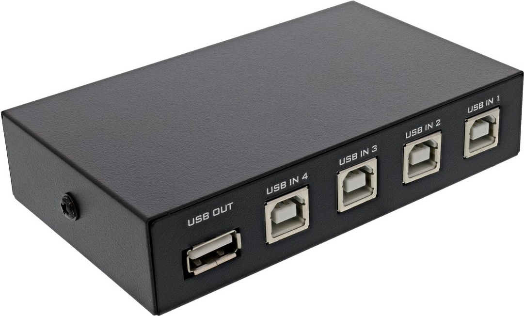 Dieser manuelle Umschalter ermöglicht das einfache Teilen von einem USB 2.0-Gerät mit USB-A Anschluss an 4 Computer. Die Umschaltung erfolgt rein mechanisch, es wird keine zusätzliche Spannungsversorgung benötigt.• Manueller USB Umschalter, 1 USB-Gerät an 4 Computer• 4x USB Buchse Typ B, 1x USB Buchse Typ A• Benötigte Kabel (4x, optional): USB Kabel Stecker A an Stecker B für die Verbindung zu den Computern• Über einen optionalen USB-Hub (nicht im Lieferumfang) können weitere USB-Geräte angeschlossen werden