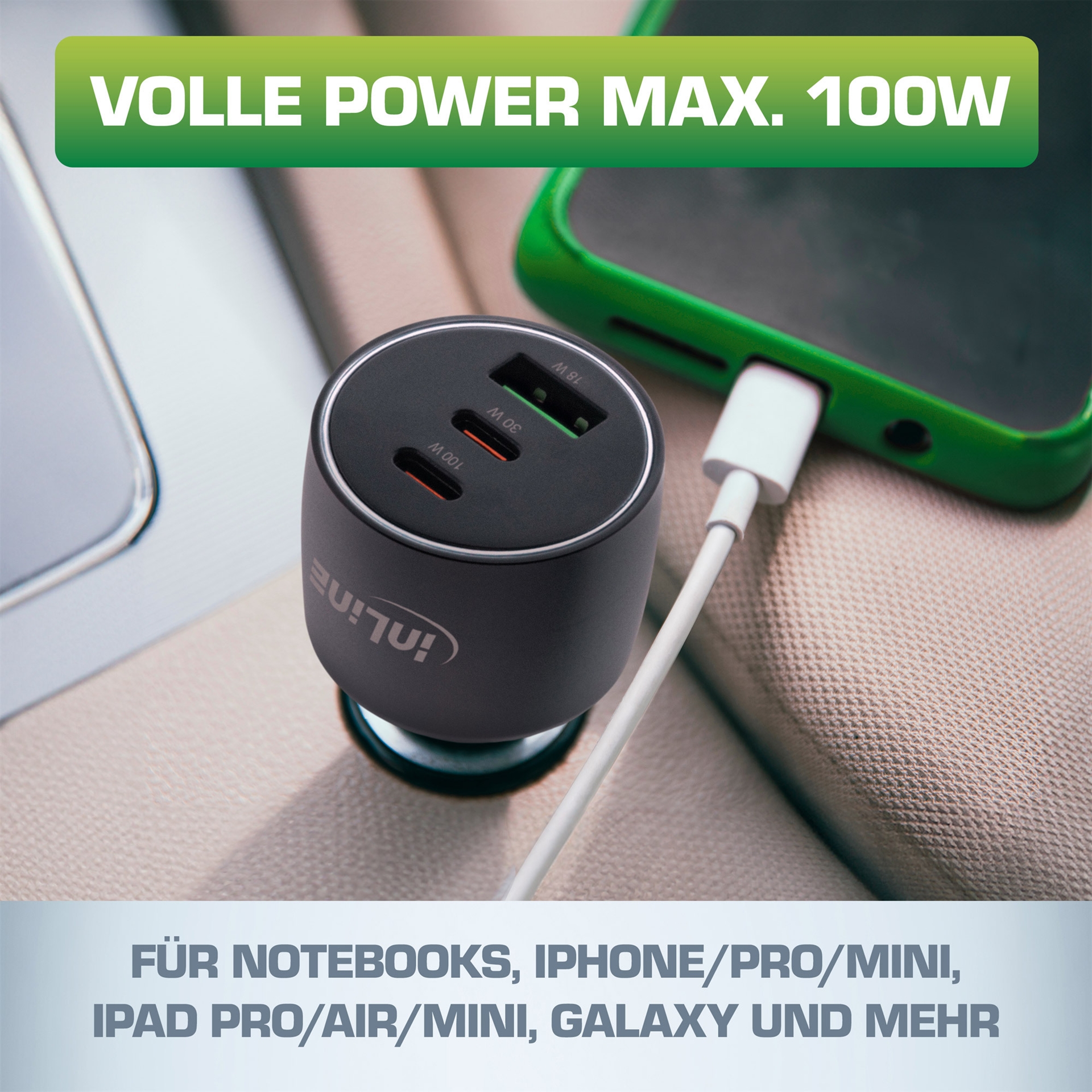 Wandeln Sie mit diesem Stromadapter die KFZ-Steckdose in einen USB-Anschluss, um Ihr Notebook, Navigationssystem, Smartphone, Tablet oder jedes weitere mobile USB-Gerät zu laden oder mit Spannung zu versorgen.• Eingangsspannung: DC 12/24V• Ausgangsspannung USB-A QC 3.0: DC 5V/3A, 9V/2A, 12V/1,5A, max. 18W• Ausgangsspannung USB-C1 Power Delivery: DC 5V/3A, 9V/3A, 12V/3A, 15V/3A, 20V/3A, 20V/5A, max. 100W• Ausgangsspannung USB-C2 Power Delivery: DC5V/3A, 9V/3A, 12V/2,5A, max. 30W• Ausgangsspannung USB-C1 + USB-C2: 65W + 30W = 95W• Ausgangsspannung USB-C1 + USB-A: 65W + 18W = 83W• Ausgangsspannung USB-C2 + USB-A: 30W + 18W = 48W• Ausgangsspannung USB-C1 + USB-C2 + USB-A: 45W + 30W + 18W = 93W• Schnittstellen: 2x USB-C, 1x USB-A• Unterstützte Ladeverfahren: Power Delivery 3.0 (PD3.0), Quickcharge 3.0 (QC3.0)• Material: Kunststoff/Aluminium• Abmessungen: ca. 85x35mm (LxB)• Gewicht: ca. 55g