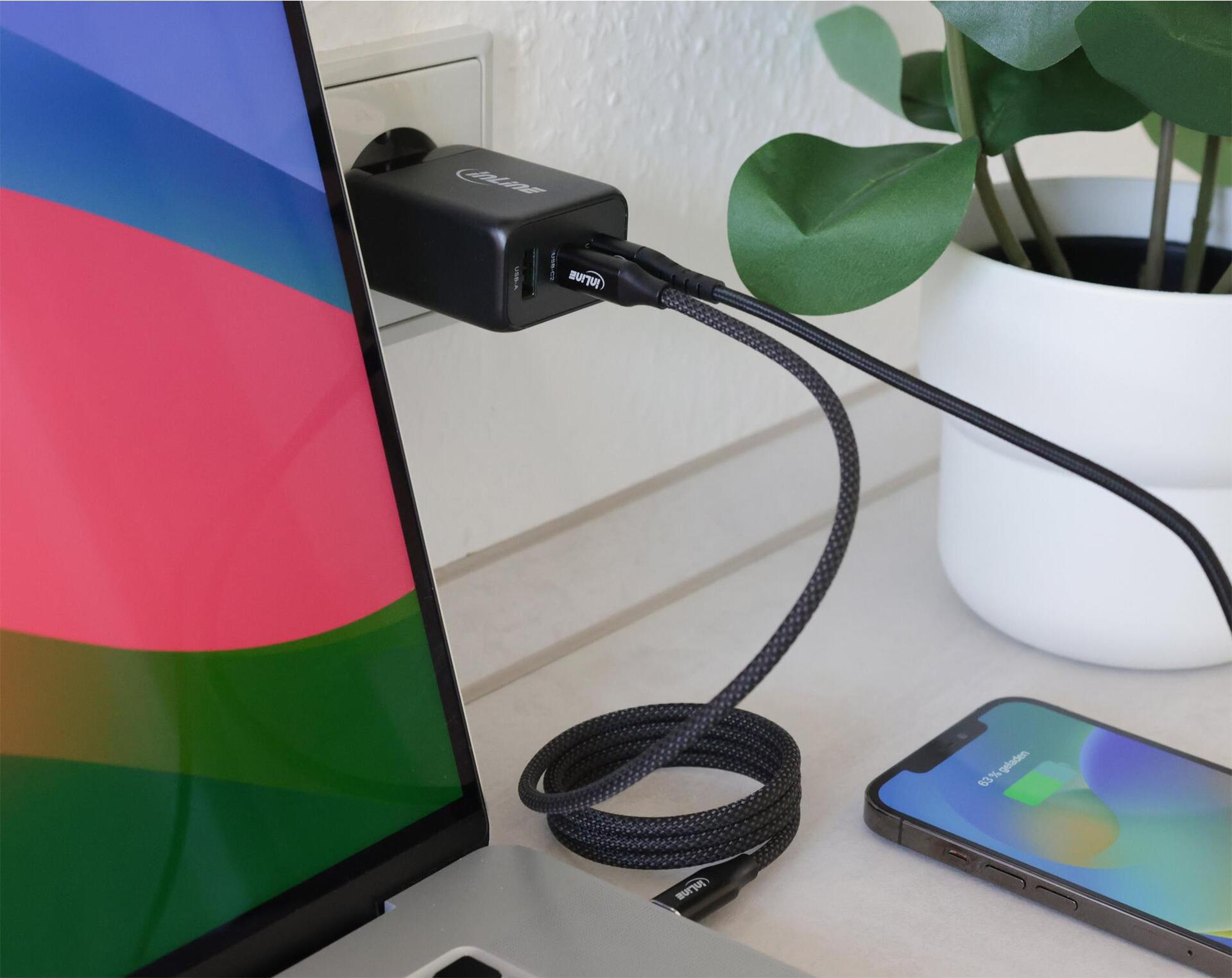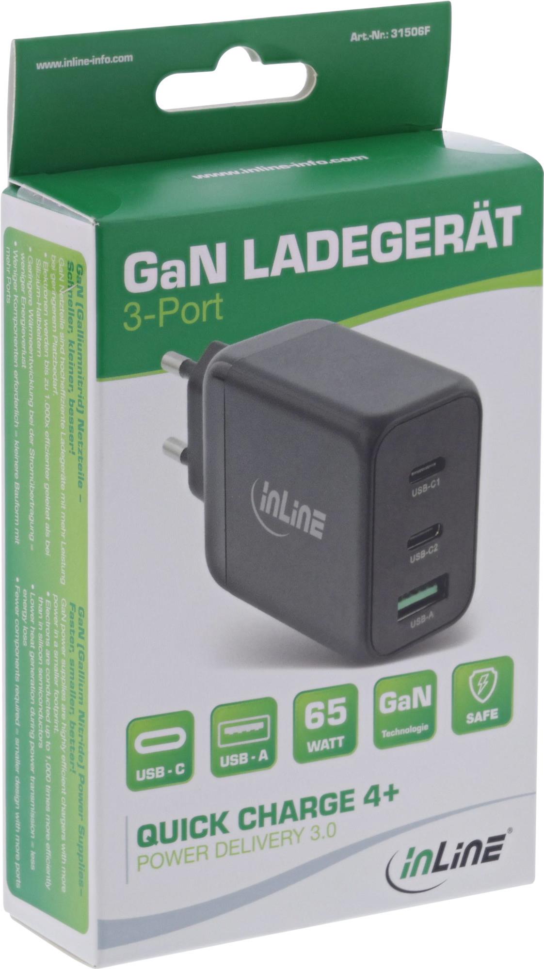 Erleben Sie das leistungsstarke und kompakte 65W GaN-Ladegerät mit 2x USB-C Anschluss und 1x USB-A Anschluss - die perfekte Lösung für schnelles und effizientes Laden mehrerer Geräte gleichzeitig! Dank der GaN (Galliumnitrid) Technologie ist dieses Netzteil hocheffizient und ermöglicht eine bessere Leistung bei gleichzeitig kleinerer Bauform. Die Elektronen werden bis zu 1.000x effizienter geleitet als bei herkömmlichen Silizium-Halbleitern, was zu einer geringeren Wärmeentwicklung und weniger Energieverlust führt. Das 65W GaN-Ladegerät unterstützt außerdem Power Delivery 3.0 und Quickcharge 4+ und bietet verschiedene Ausgangsoptionen.• Eingangsspannung: AC 100-240V• Eingangswechselstromfrequenz: 50/60 Hz, 1,5 A• Ausgangsspannung: 3,3-20,0 V DC• Ausgangsstrom: max. 5,0 A• Ausgangsleistung: 65,0 W• Durchschnittliche Effizienz im Betrieb: 86,67 %• Effizienz bei geringer Last (10%): 76,64 %• Leistungsaufnahme bei Nulllast: 0,27 W• USB-C1/C2 Ausgang: 3,3-11,0V / 3,0A oder 5,0V/3,0A oder 9,0V/3,0A oder 12,0V/3,0A oder 15,0V/3,0A oder 20,0V/3,25A (65,0W max)• USB-A Ausgang: 4,5V/5,0A oder 5,0V/4,5A oder 9,0V/3,0A oder 12,0V/2,5A oder 20,0V/1,5A (30,0W max)• USB-C1+USB-C2 Ausgang: 45,0W + 18,0W (63,0W max)• USB-C1+USB-A Ausgang: 45,0W + 18,0W (63,0W max)• USB-C2+USB-A Ausgang: 5,0V/3,0A (15,0W max)• USB-C1+USB-C2+USB-A Ausgang: 45,0W + 5,0V/3,0A• USB PD 3.0 kompatibel, Quickcharge 4+ und abwärtskompatibel• Abmessungen: 95,7x47,2x29,4mmProdukttext