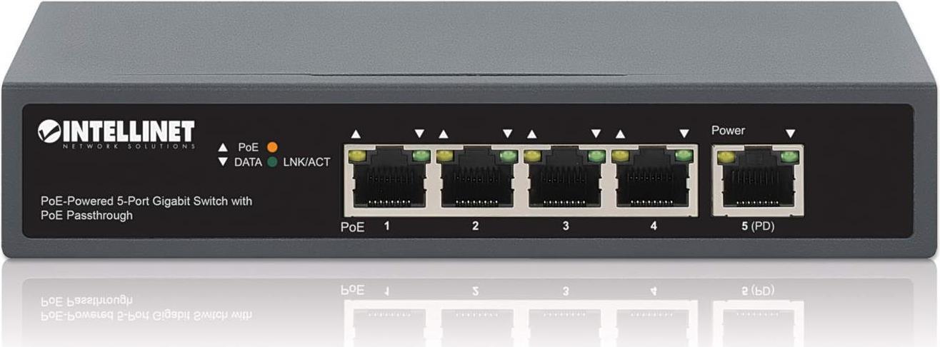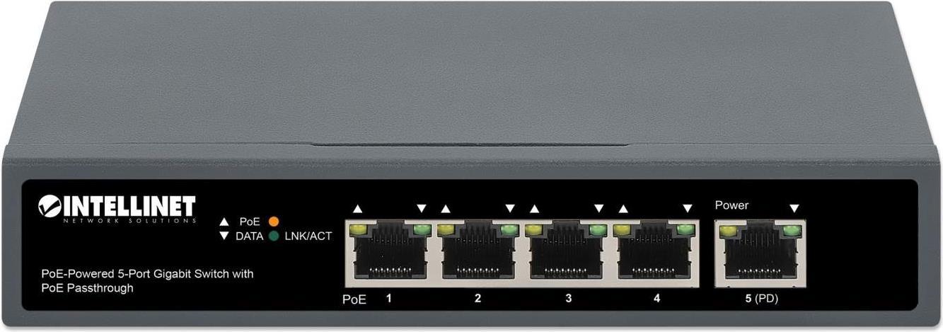 Der Intellinet 5-Port PoE Gigabit Switch mit PoE-Passthrough wurde konzipiert für die Stromaufnahme von einem PoE-Switch und die Daten- und Stromübertragung an PoE-kompatible Geräte über Cat5eoder Cat6-Netzwerkkabel. Er ist ausgestattet mit fünf Gigabit-Ethernet-Ports und kann bis zu vier Access Points, VoIP-Telefone, und/oder IP-Kameras mit Strom versorgen. Seine eigene Stromversorgung bezieht er von dem verbundenen PoE-Switch und überträgt Daten mit bis zu 1.000 Mbit/s.