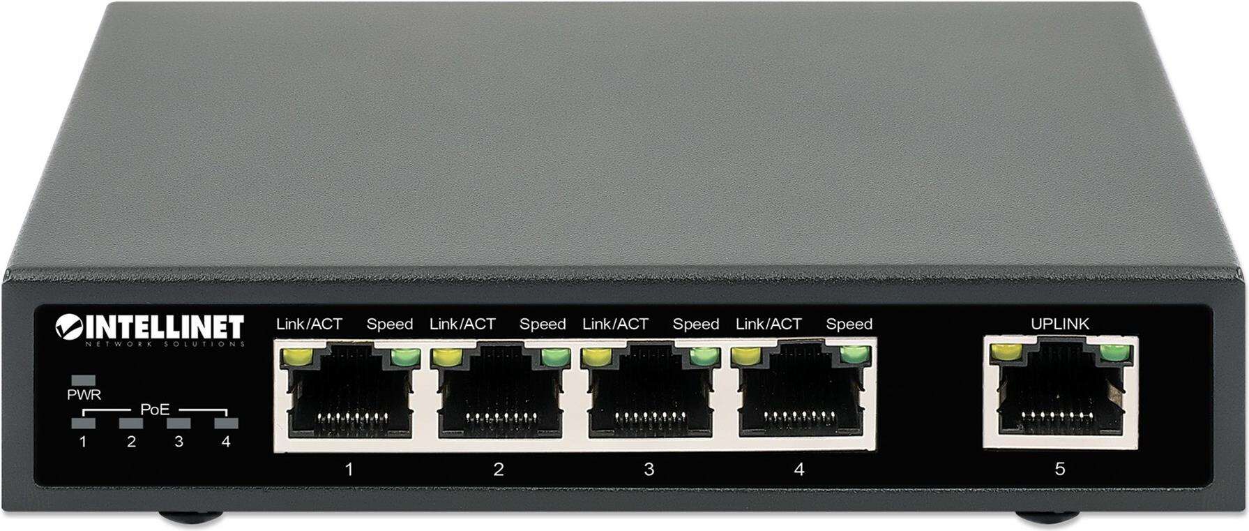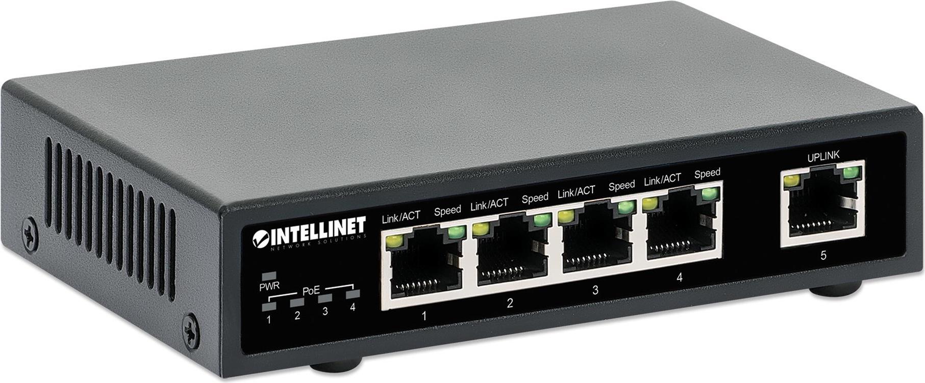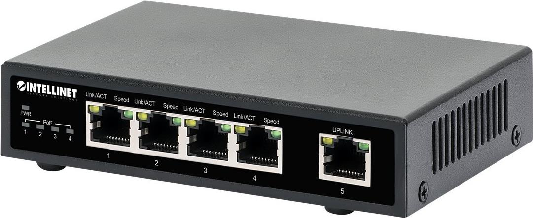 Der 5-Port Gigabit Ethernet PoE+ Switch von Intellinet Network Solutions überträgt sowohl Daten als auch Strom an eine Reihe von PoE-kompatiblen Geräten über Standard Cat5e oder Cat6 Netzwerkkabel. Ausgestattet mit fünf Gigabit-Ethernet-Ports - vier davon sind High-Power-PoE+-PoE-Ports - kann dieser Switch Wireless-LAN-Access-Points und -Bridges, VoIP-Telefone, IP-Videokameras und mehr mit Strom versorgen und dabei Netzwerkgeschwindigkeiten von bis zu 1000 Mbit/s liefern.