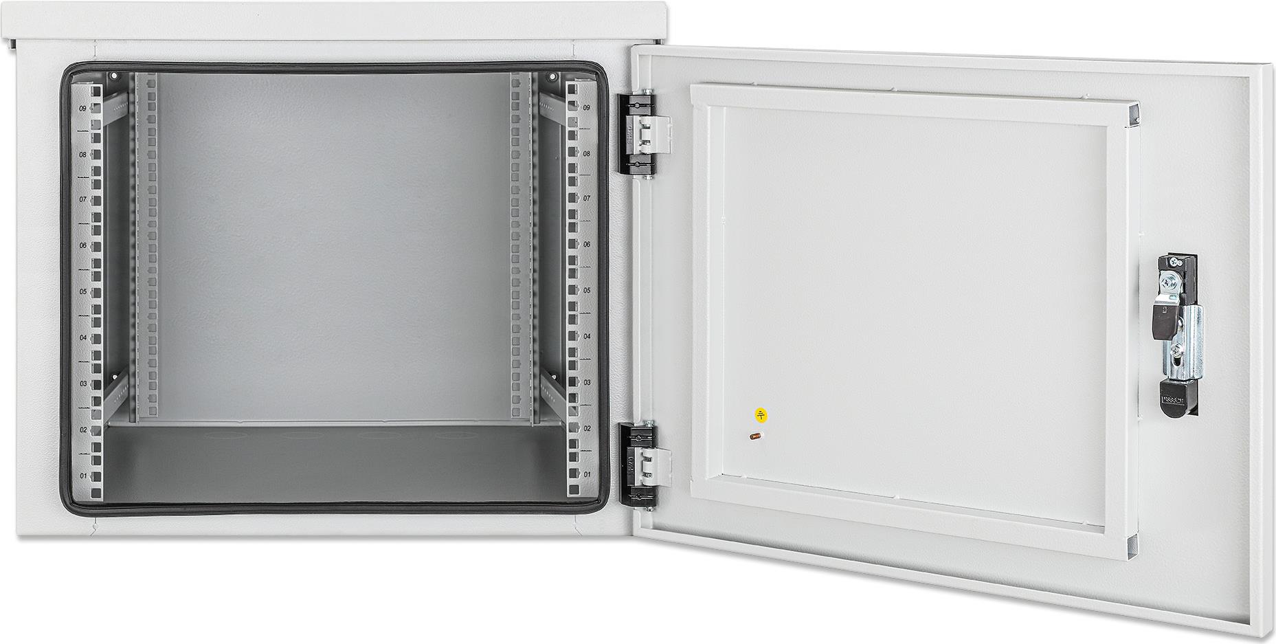 INTELLINET Industrieller IP55 48,30cm (19") Wandverteiler mit integrierten Lüftern, 9 HE 600 mm Tiefe, Kühleinheit mit zwei Lüftern im Dach integriert, staub- und wasserdichtes Gehäuse, montiert, lichtgrau RAL7035 (716093)