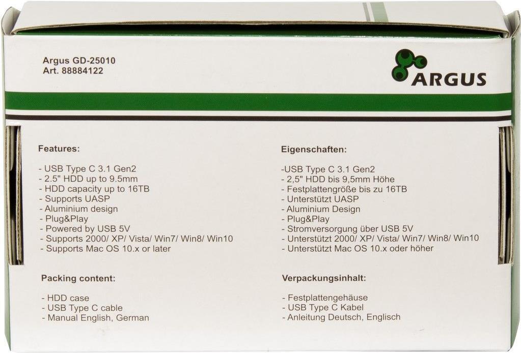 Das GD-25010 kann nicht nur mit seinem superschnellen USB 3.1 Gen 2 Type C Anschluss und einer Datentransferrate von bis zu 10 Gbit/s trumpfen, auch das elegante Aluminium-Gehäuse mit abgerundeten Ecken und gebürsteter Oberfläche überzeugt auf voller Länge.Im Inneren findet eine 2,5\" SSD ihren Platz, die einfach und schnell mit dem beiliegen Schraubendreher in Sekunden installiert ist.Hauptmerkmale