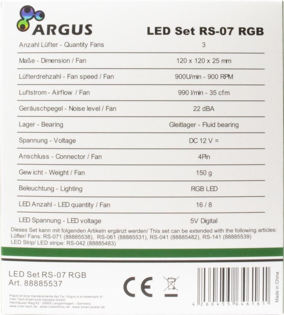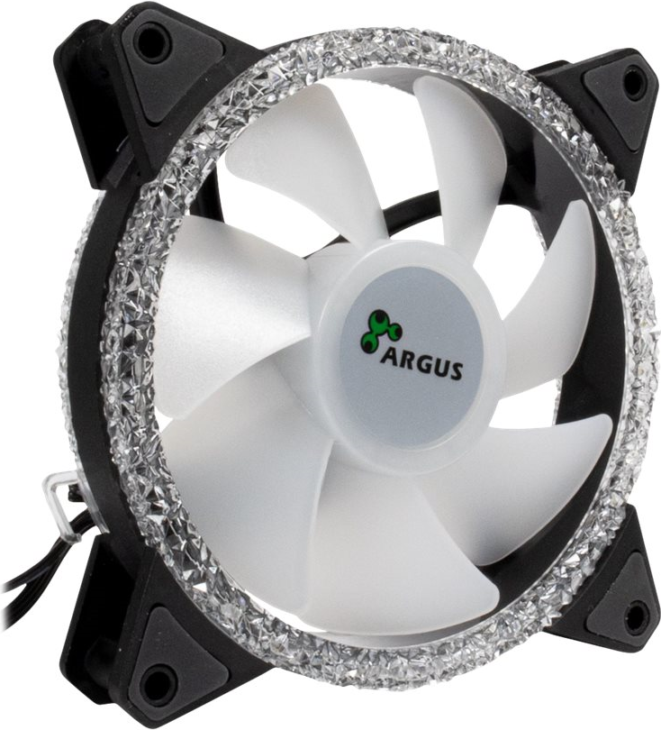 Die drei 4-Pin PWM 120 mm RGB-Lüfter von Argus bieten eine tolle Beleuchtung für Ihr PC-Gehäuse und bieten mit der beiliegenden Funk-Fernbedienung und der Steuerungseinheit über 300 verschiedene Effekte und Modi. Wem das nicht ausreicht, kann zudem über den integrierten 5V RGB-Header (adressierbare RGB-LEDs), alle RGB-LEDs synchron über das Mainboard verwalten und steuern.Die jeweils 24 integrierten RGB-LEDs, platziert hinter jeweils zwei transparenten Kristall-Effekt-Ringen pro 120 mm Lüfter, sind der Garant für außergewöhnliche Lichteffekte. Gummierte Auflagen unterhalb der Befestigungslöcher verhindern bei den Lüftern zuverlässig die Übertragung von Vibrationen auf das PC-Gehäuse und sorgen für einen laufruhigen Betrieb bei bis zu 1200 U/min und 22 dBA.Das Set lässt sich problemlos mit bis zu fünf weiteren, optional erhältlichen Argus RGB-Lüftern und zwei ebenfalls optional erhältlichen Argus RS-042 RGB LED-Streifen erweitern.