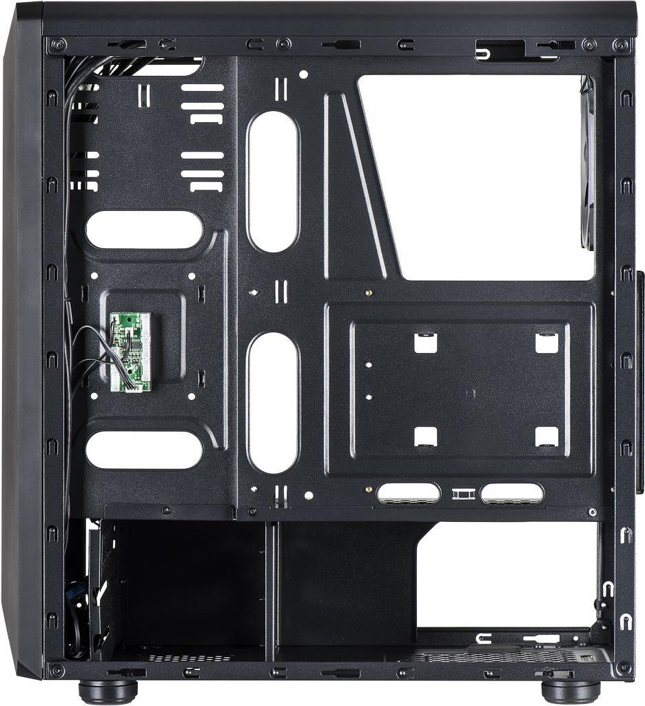 Auf dem Deckel des Gehäuses befindet sich ein magnetischer Staubfiltereinsatz. An der Front finden sich USB 2.0 und 3.0 Anschlüsse, die HD-Audio Buchsen sowie alle wichtigen Schalter vor, unter anderem den zum manuellen Durchschalten der LED-Effekte. Ein herausnehmbarer Staubfilter unter dem Netzteil sowie vielfältige Möglichkeiten zum Verlegen der Kabel, komplettieren das Angebot.