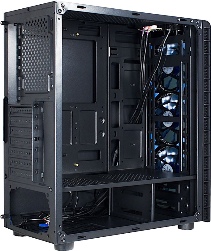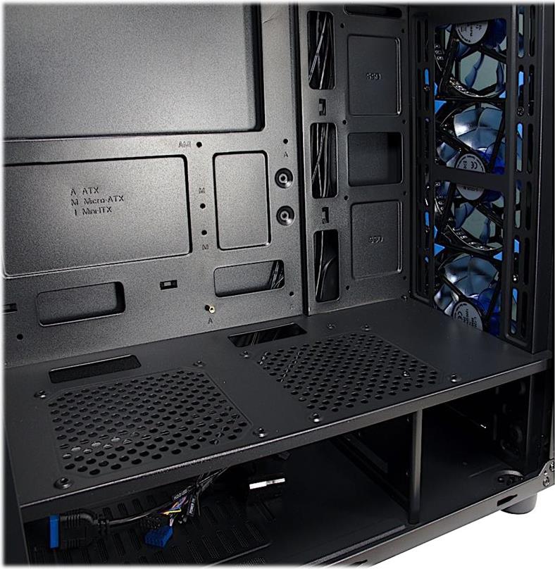 | Kühlsystem | Vorderseite: 120 mm Lüfter x 3 / blaue LED, Unterstützung für 2 140-mm-Lüfter Rückseite: 120 mm Lüfterhalterung x 1 Oberseite: 120/140 mm Lüfterhalterung x 2 |