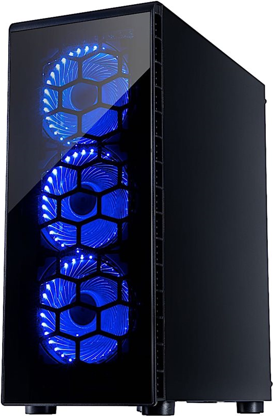 Eine durch drei blaue Argus L-12025 LED-Lüfter beleuchtete Front macht das CXC2 Gehäuse zu einem wahren Eye-Catcher. Die Front besteht aus Tempered Glass, mit trendigem Honeycomb-Muster dahinter, und wird durch ein Fensterseitenteil aus Acrylglas ergänzt. Platz und Anschlussmöglichkeiten für weitere Lüfter, eine wahlweise 120 mm oder eine 240 mm Wasserkühlung sowie diverse Festplatten finden sich im geräumigen Innenraum des CXC2 vor.